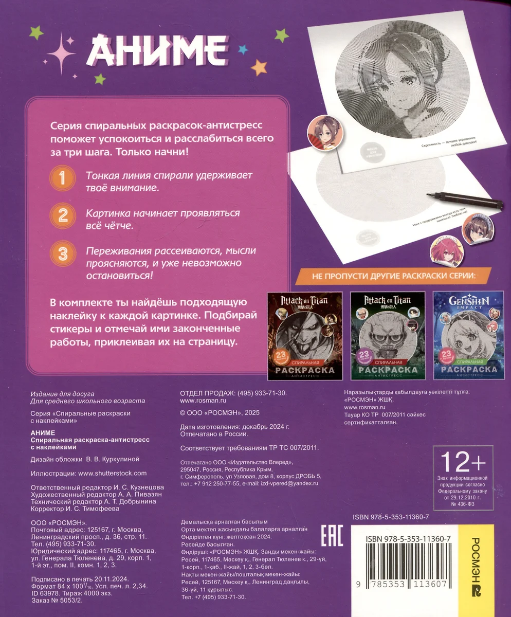Серия спиральных раскрасок-антистресс поможет успокоиться и расслабиться. 23 зашифрованные картинки завладеют вашим вниманием, как только карандаш коснется спирали. В комплекте к каждой картинке вы найдете подходящую наклейку. Подбирайте стикеры и отмечайте ими законченные картинки, приклеив на страницу. Отвлекитесь от ежедневной суеты вместе с персонажами в стиле аниме.