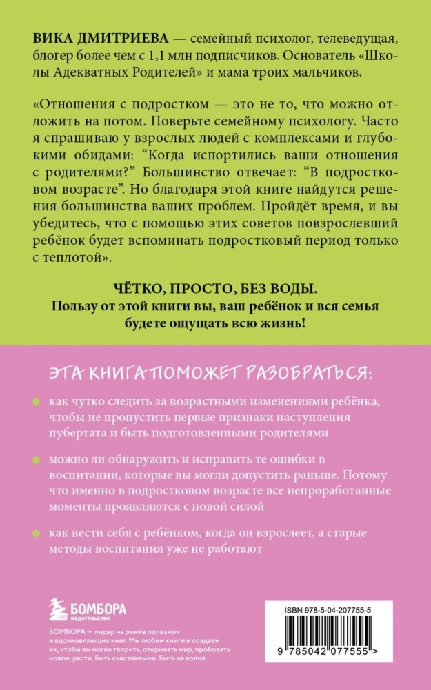 Что ждёт родителей подростка? Можно ли как-то подготовиться к тому, что ваш милый и послушный малыш превратится в недовольное нечто, которое бунтует и закрывается от вас? Подростки раздражают родителей, родители бесят подростков. Вместе с раздражением растёт и родительский страх: а вдруг не сдаст экзамены, закурит, убежит из дома! Почему с подростками так сложно? Ответ на этот и множество других вопросов вы найдёте в книге семейного психолога, телеведущей, популярного блогера и мамы трёх мальчиков Вики Дмитриевой. В издание входят главы и упражнения, которых не было раньше: как решать конфликты, повысить самооценку, развить критическое мышление у подростка и другое.