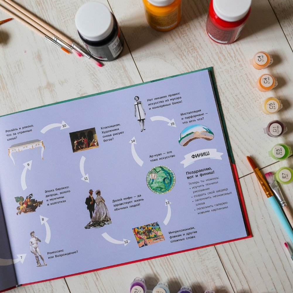 Узнай, как искусство изменило мир. Прочитай о Древнем Египте, напиши иероглифами собственное имя, помоги художникам дорисовать картины и путешествуй во времени! Вместе с этой книгой ты поймёшь, зачем люди рисовали богов и строили огромные соборы, кто придумал масляные краски и первый самолёт, откуда художники брали идеи для своих картин, как назывались разные эпохи в искусстве, а в конце даже создашь свой собственный шедевр.