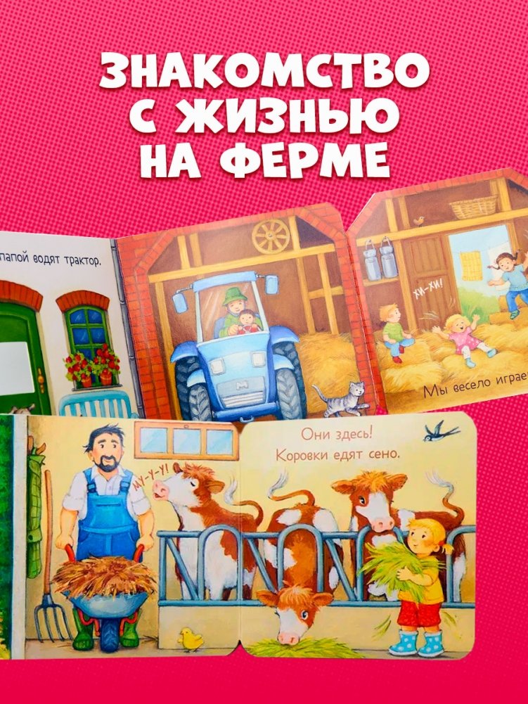 Каждый разворот расскажет маленькую историю о каком-то уголке фермы: девочки и мальчики побывают в сарае и курятнике, узнают, где живут коровки и кролики. Клапан раскроется в большую панорамку. Кроме того, ребенок будет развивать мелкую моторику, внимание, память и речь, повторяя простые звуки вместе со зверюшками: «Ко-ко-ко!», «Кукареку!», «Му-у-у!».