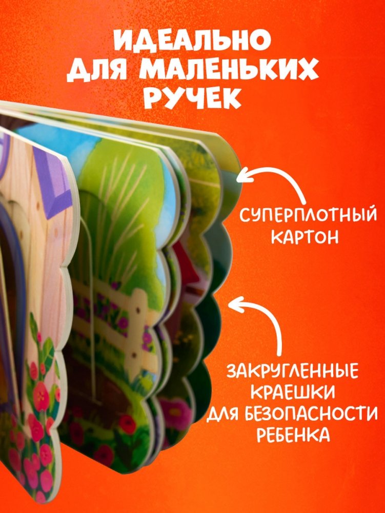 Книга сделана из плотного картона, так что створки прослужат долго и выдержат много веселых игр! Закругленные краешки не поранят малыша острыми углами.