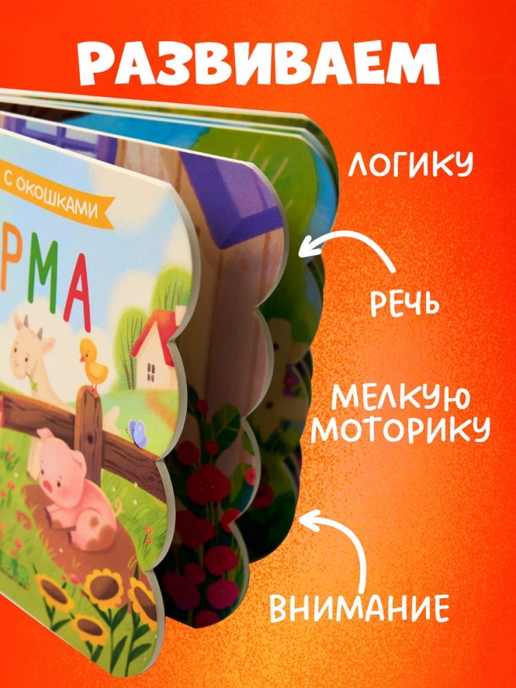 Книжка с окошками «Ферма» познакомит вашего ребенка с животными, которые живут на ферме, и поможет в развитии мелкой моторики, речи, логики, внимания. А створки из плотного картона превратят ваши занятия в веселье!