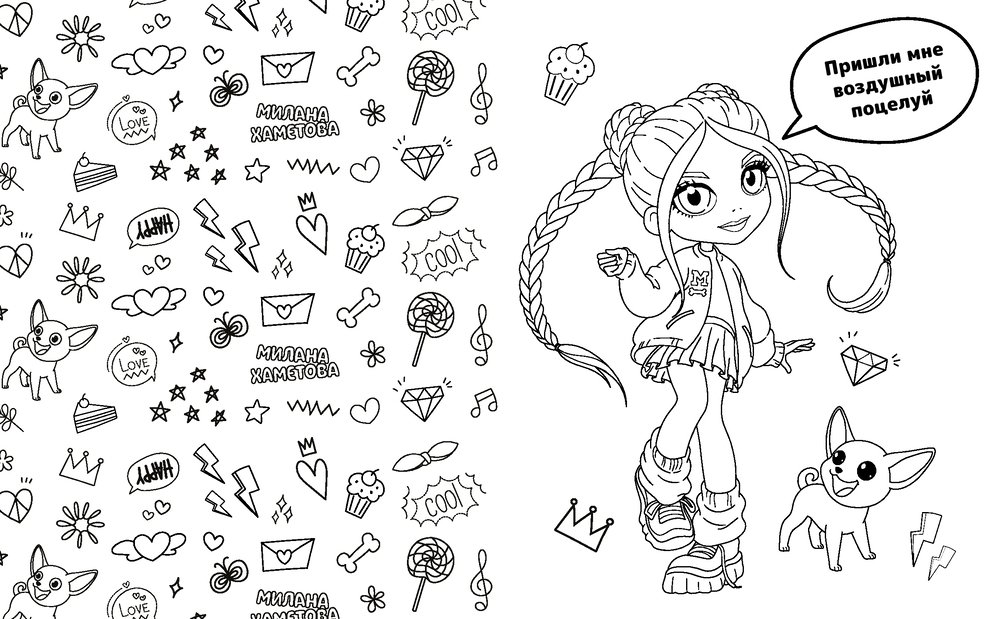 Милана Хаметова – популярная блогер, певица и начинающая актриса, участница проекта SuperHouse, номинант рейтинга Forbes "30 до 30" и просто очень классная девчонка. В этой раскраске ты найдёшь окрашительные арты, творческие задания и набор ярких наклеек! Мечтай, твори и улыбайся, разгоняя тучки!