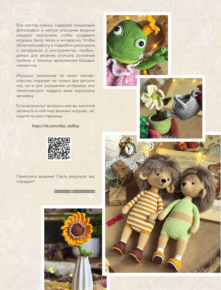 В книгу вошли 5 мастер-классов. Вы сможете связать влюбленных вишенок, лягушек Жабера и Жабетту, ежиков Пинкуса и Пруденс, детективов Шерлу Фокс и Доктора Таксона. Все мастер-классы содержат пошаговые фотографии и подробное описание вязания каждого персонажа, чтобы создавать их было легко и интересно. Игрушки не только подойдут детям, но и станут украшением интерьера или тематическим подарком для взрослого человека. Также автор подробно разобрал все необходимые для работы материалы и инструменты, описал основные приемы и техники выполнения всех элементов. Внутри книги вы также найдете подарок: дополнительный мастер-класс по вязанию снеговика и снежки!