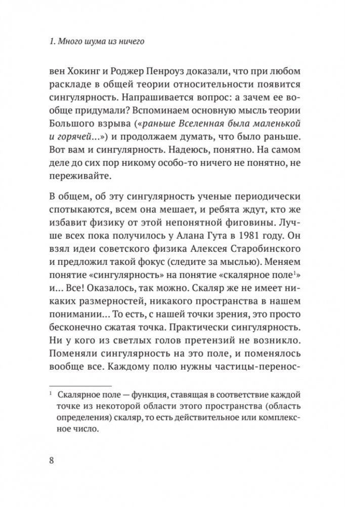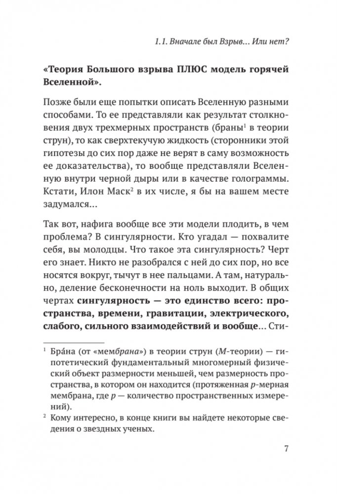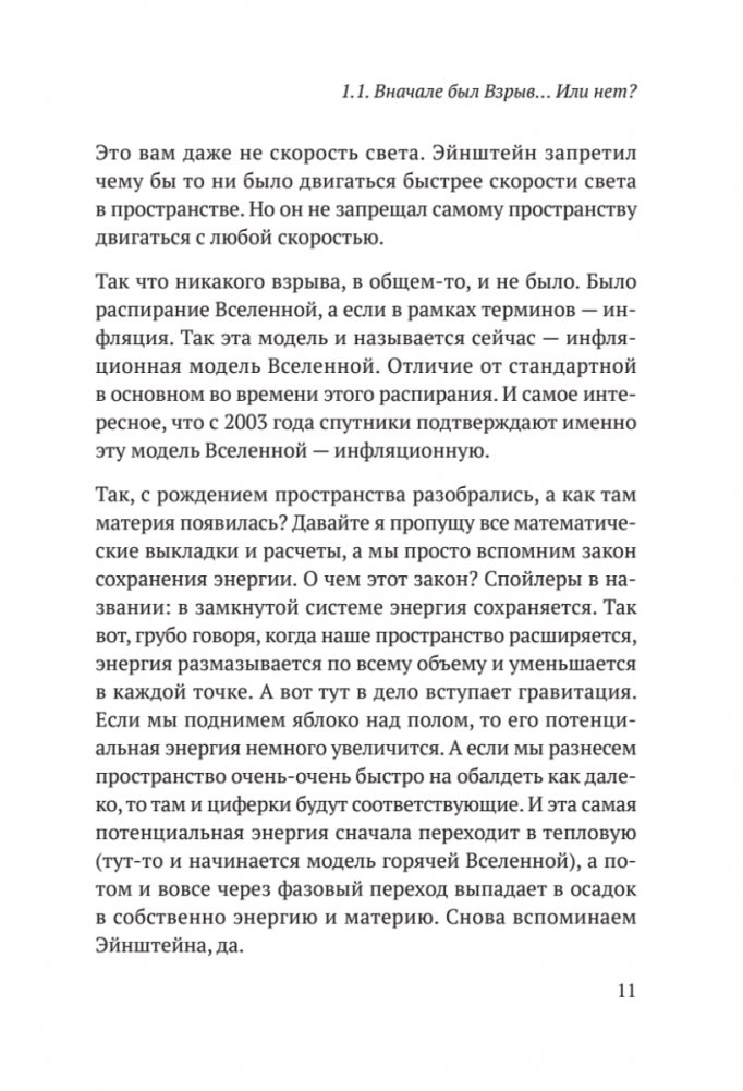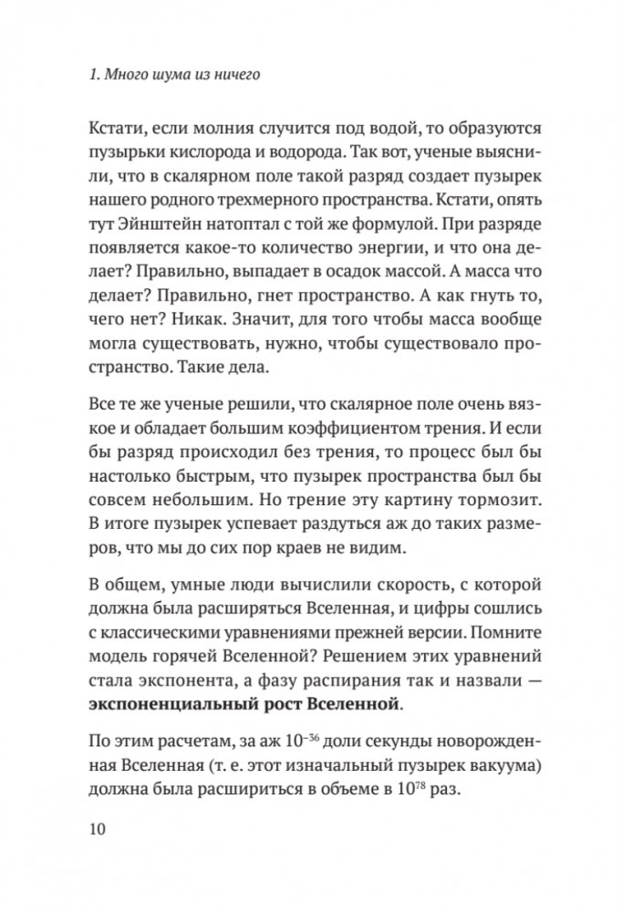 Автор понятным языком, с большой долей юмора разбирает проблемы современной физики. Объясняет, что такое чёрные дыры, изучает «генеалогическое древо» вещества, рассказывает историю возникновения квантовой физики (а вы знали, например, что кот Шрёдингера был призван опровергнуть положения квантовой механики, но в итоге сам стал ярким её примером?).