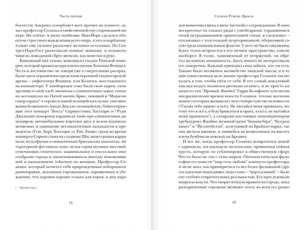 Малик Соланка, миллионер из Бомбея, получивший образование в Кембридже, пытается убежать от самого себя. Он бросает мир науки, становится кукольником, но, когда в нем поселяется ярость, с которой он боится не совладать, Соланка оставляет семью и отправляется за океан. Он надеется обрести покой и забвение в сердце Нью-Йорка, переживающего дни неслыханного изобилия. Но повсюду вокруг него — ярость… Удивительный роман, безжалостная черная комедия, шокирующее проникновение в самые темные стороны человеческой натуры.