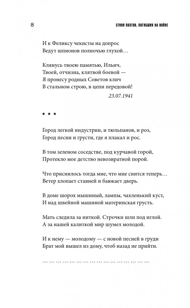 "Строки, рожденные в боях", "строки, оборванные пулей" - за этими расхожими выражениями, ставшими слишком привычными, стоят судьбы и трагедии многих людей. 22 июня 1941 года навсегда разделило миллионы судеб на "до" и "после". Но для авторов этой книги никакого "после" не было. Все они отдали жизнь за Победу, за Родину, за мир. И все они были поэтами, не по профессии – по духу. Их опаленные войной строки читали в окопах и блиндажах, печатали в газетах, перечитывали в полных нежности письмах. В этих строках, зачастую неумелых, наивных – истовость любви к Родине, неугасимое пламя мужества, ярость святой ненависти к врагу. Бесконечно трогательные, правдивые, искренние – их стихи не могут устареть, ведь ничто подлинное, настоящее, чистое не подвластно времени. Потому и сегодня они настолько злободневны и понятны каждому, что только даты жизни их авторов напоминают, сколько им лет.