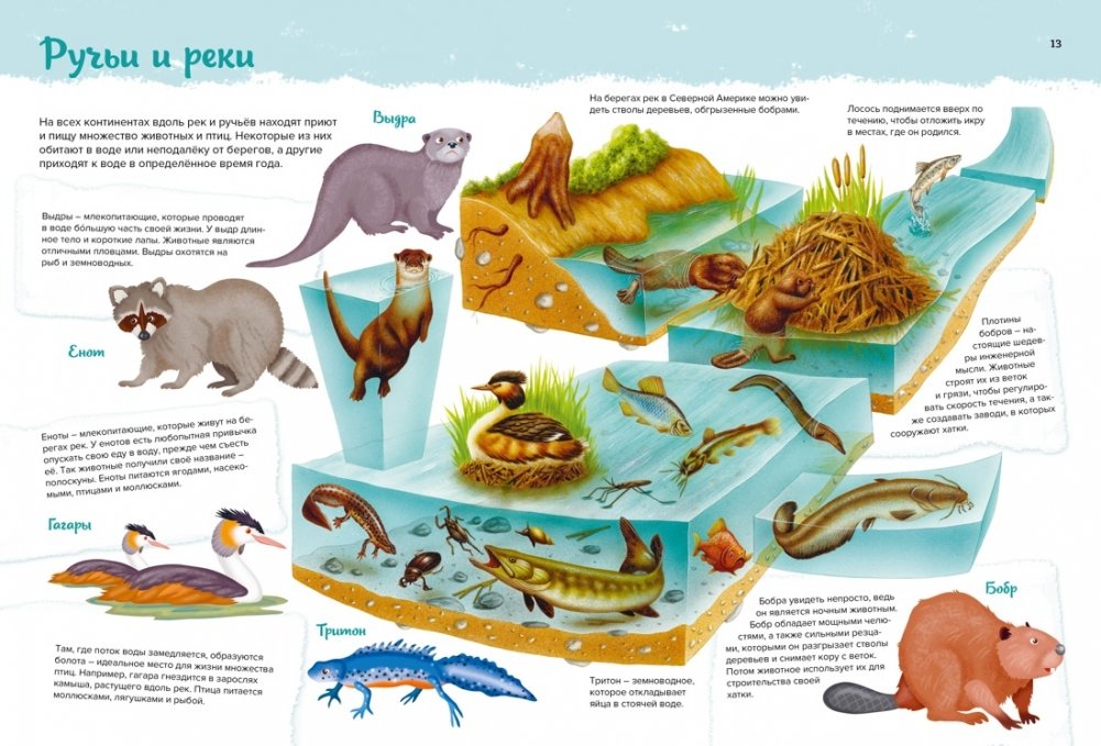 Где гнездятся вальдшнепы? Чем питаются лемуры вари? Когда свиристели вьют свои гнёзда? Сколько существует видов муравьёв? Как вилороги спасаются от хищников? На страницах этого иллюстрированного атласа вы познакомитесь с представителями царства животных, которые обитают в разных природных зонах нашей планеты. Из книги вы узнаете, зачем черепахи выкапывают норы, где живут зимородки, какая любопытная привычка есть у енотов и чем питаются коалы. Красочные иллюстрации позволят рассмотреть животных вблизи и выяснить, какие внешние особенности выделяют их среди сородичей.