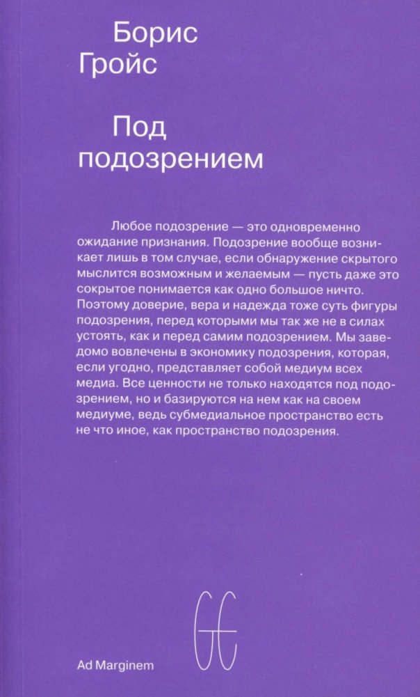 В эссе «Под подозрением» (2000) Борис Гройс предлагает рассмотреть, что скрывается под семиотической поверхностью нашей культуры — темное субмедиальное пространство, притаившееся позади картины мира. Для зрителя оно всегда оказывается причиной сомнений и страхов, но с другой стороны, источником неожиданных открытий и невольных прозрений. В ситуации исключения пронзительный критический взгляд, алчущий медиальной откровенности, находит расщелину, в которой на мгновение обнажается истина. Этот момент оборачивается появлением новых знаков, вплетающихся впоследствии в общую ткань. Опираясь на различные философские тексты, исследующие сомнение и взгляд Другого (от Декарта, Хайдеггера, Сартра, Мосса и Батая до постструктуралистских изысканий Лакана и Деррида), Гройс определяет онтологическое подозрение как медиум всех медиа, как фундамент, обеспечивающий репродуцируемость и постоянство архива нашей культуры.