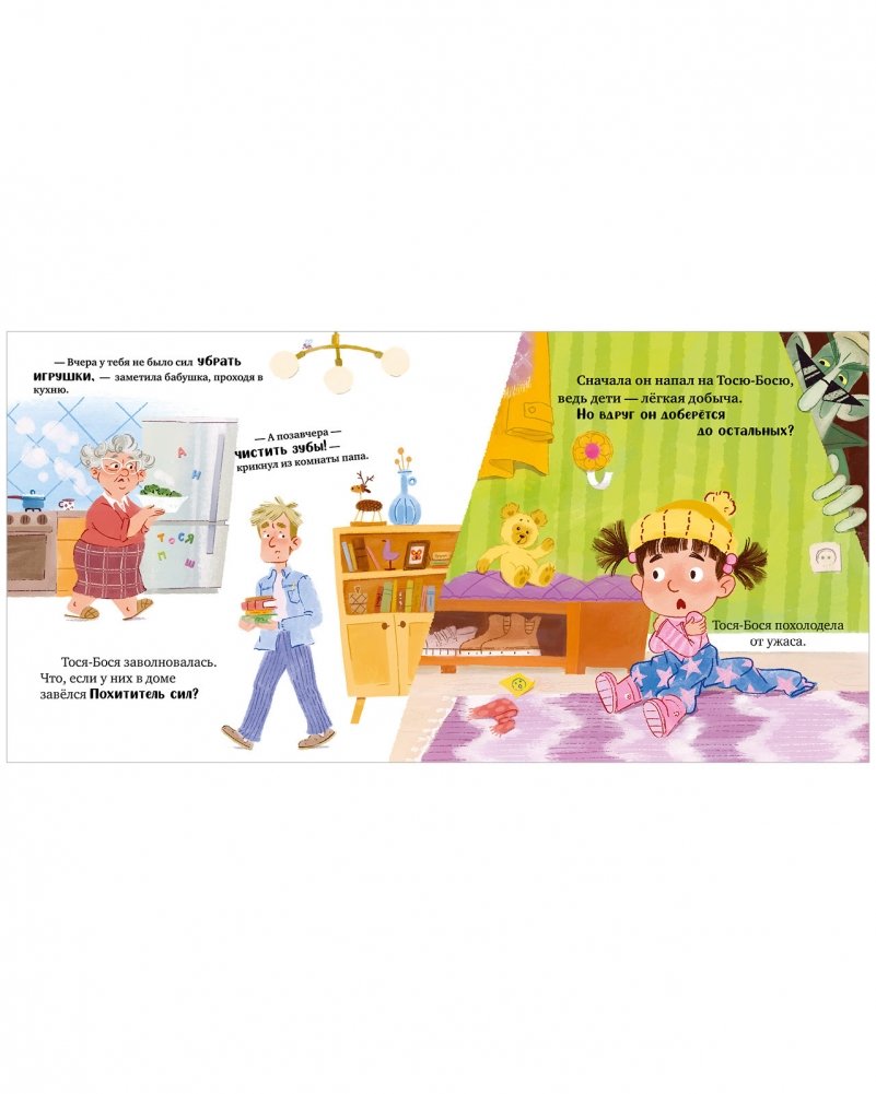 Тося-Бося может часами играть, бегать, летать с горки. Ее энергия неиссякаема… Но стоит Тосе-Босе подумать о мытье рук и чистке зубов, как ее силы вдруг пропадают. Кажется, во всем виноват коварный Похититель сил! Что, если он доберется до мамы и она не сможет печь блинчики из-за упадка сил? Или до папы? До бабушки? Тося-Бося полна решимости победить негодяя.