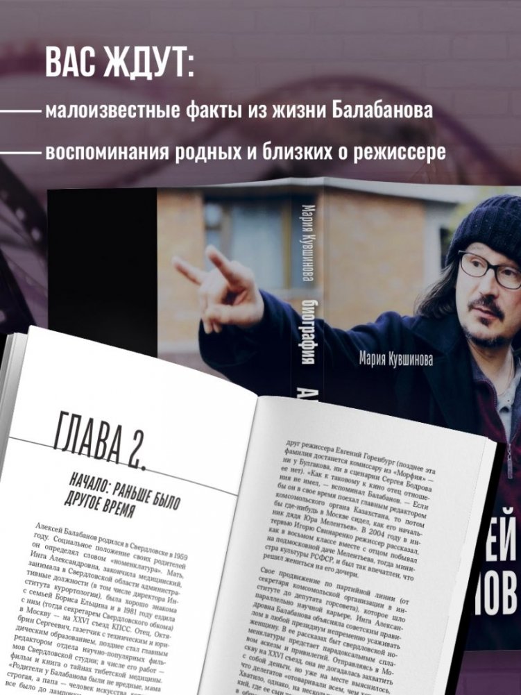 Обновленное издание книги Марии Кувшиновой о режиссере Алексее Балабанове. В основу книги легли разговоры с близкими режиссера - мамой Ингой Александровной Балабановой, его школьным другом Евгением Горенбургом, продюсером Сергеем Сельяновым, женой и художником по костюмам Надеждой Васильевой, Никитой Михалковым и др.