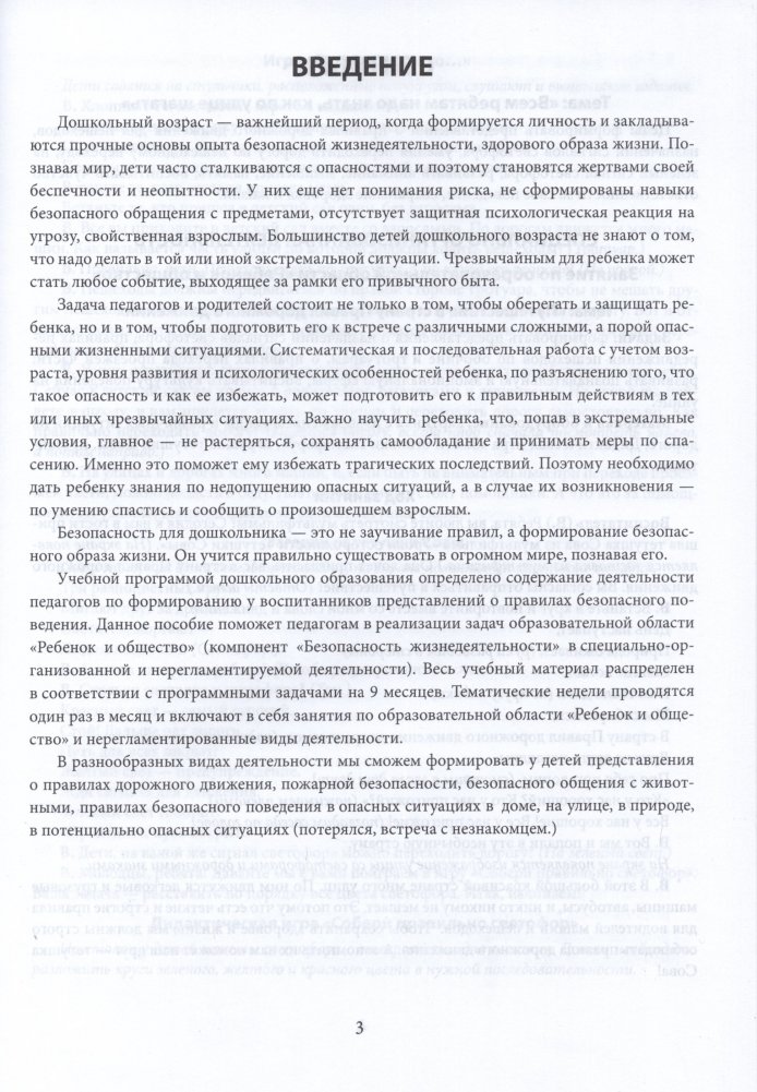 Пособие разработано в соответствии с учебной программой дошкольного образования и охватывает задачи образовательной области "Ребенок и общество", включая компонент "Безопасность жизнедеятельности". Материал распределен в соответствии с программными задачами на 9 месяцев. Предложенные виды деятельности будут способствовать усвоению детьми знаний о безопасноcти в различных жизненных ситуациях, что поможет подготовить их к самостоятельному и безопасному существованию в окружающем мире.
