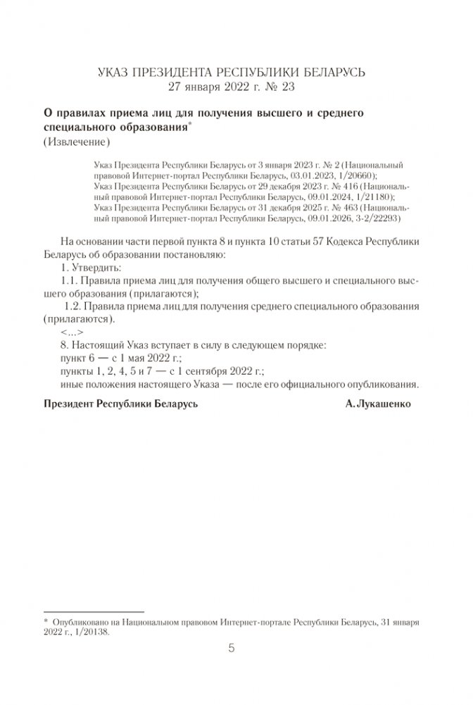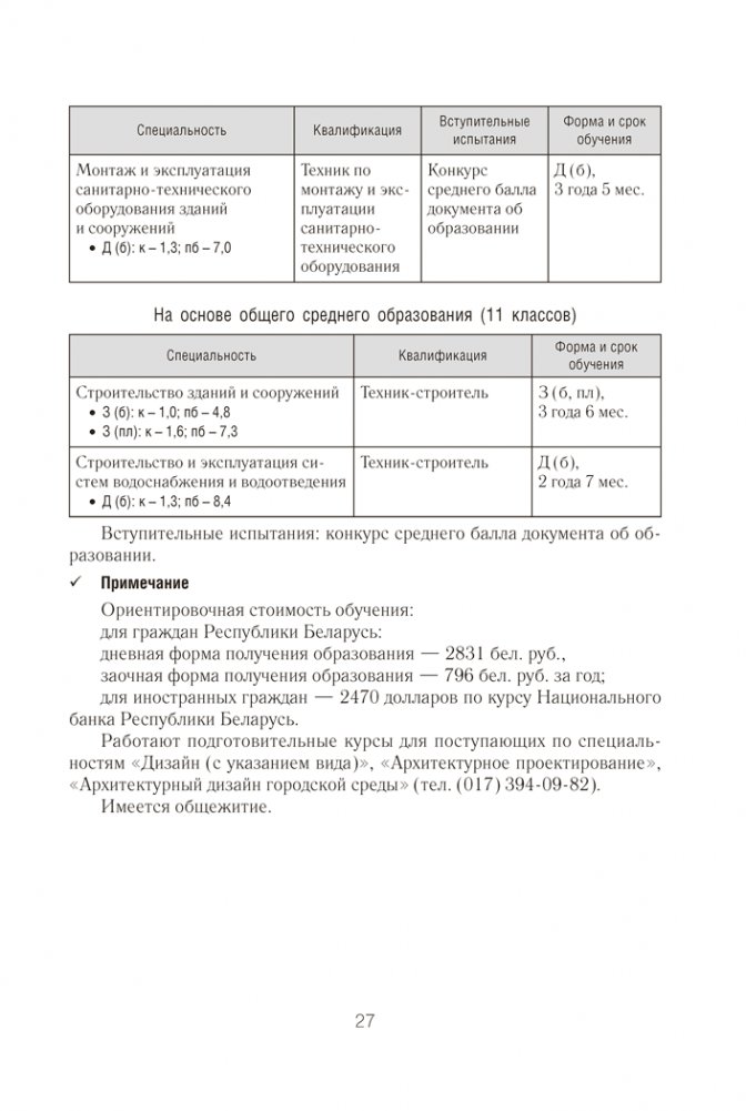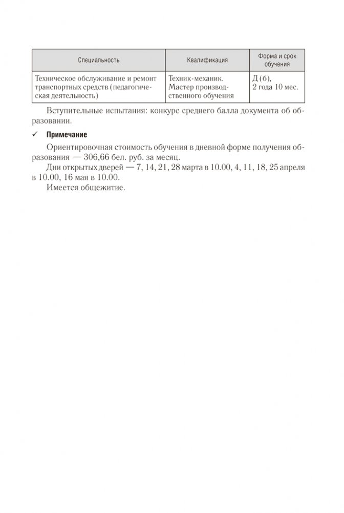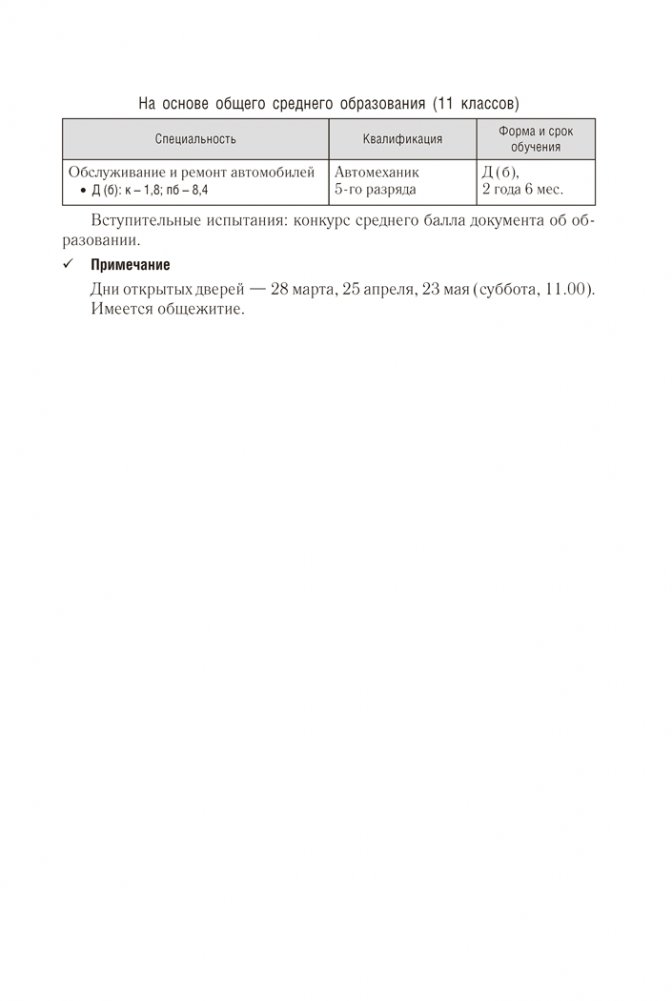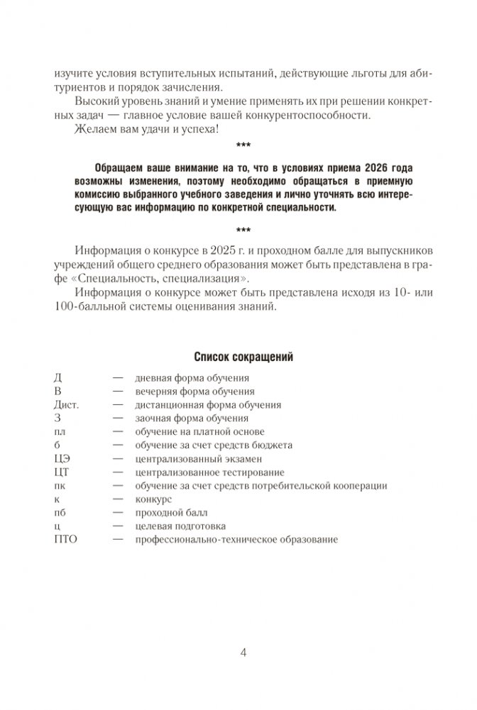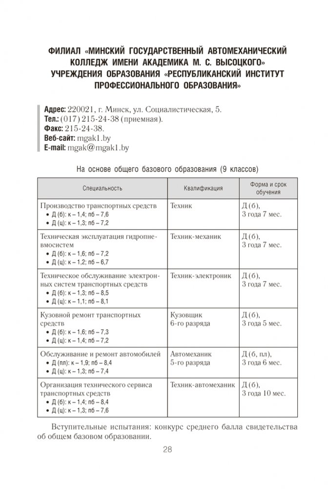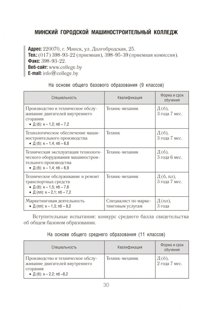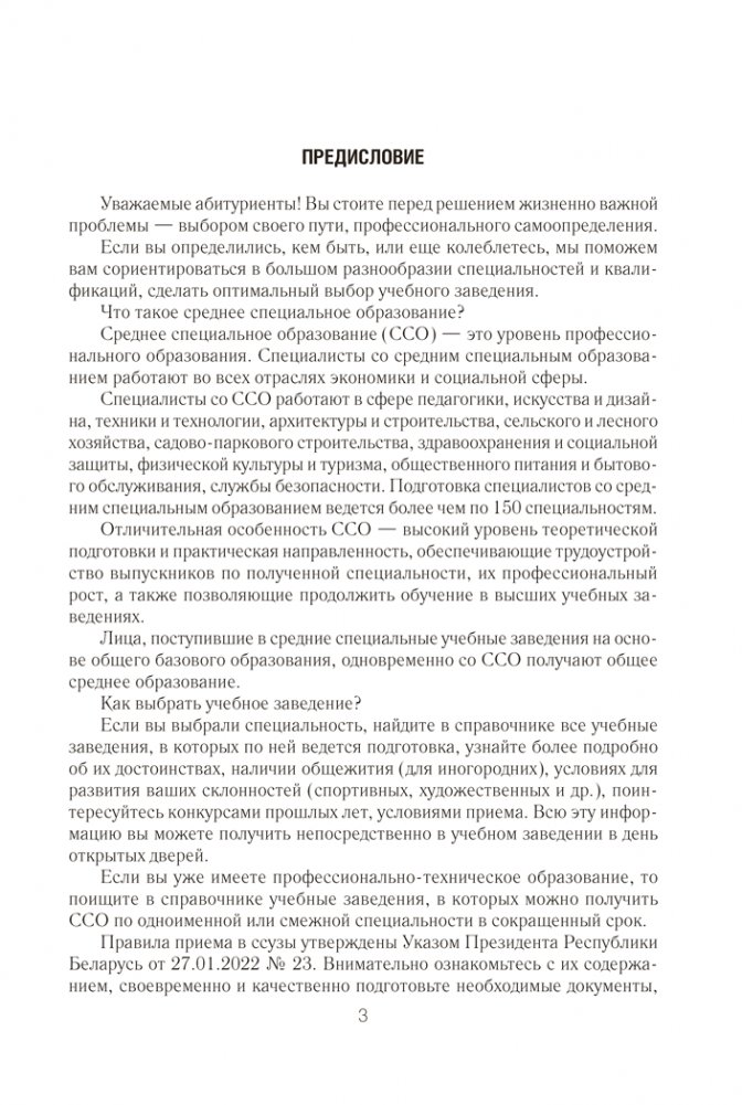В справочнике содержатся Правила приема лиц для получения среднего специального образования в Республике Беларусь и информация об учреждениях среднего специального образования (адрес, веб-сайт, специальности, квалификации, формы получения образования, вступительные испытания, конкурс и проходной балл в 2025 году).