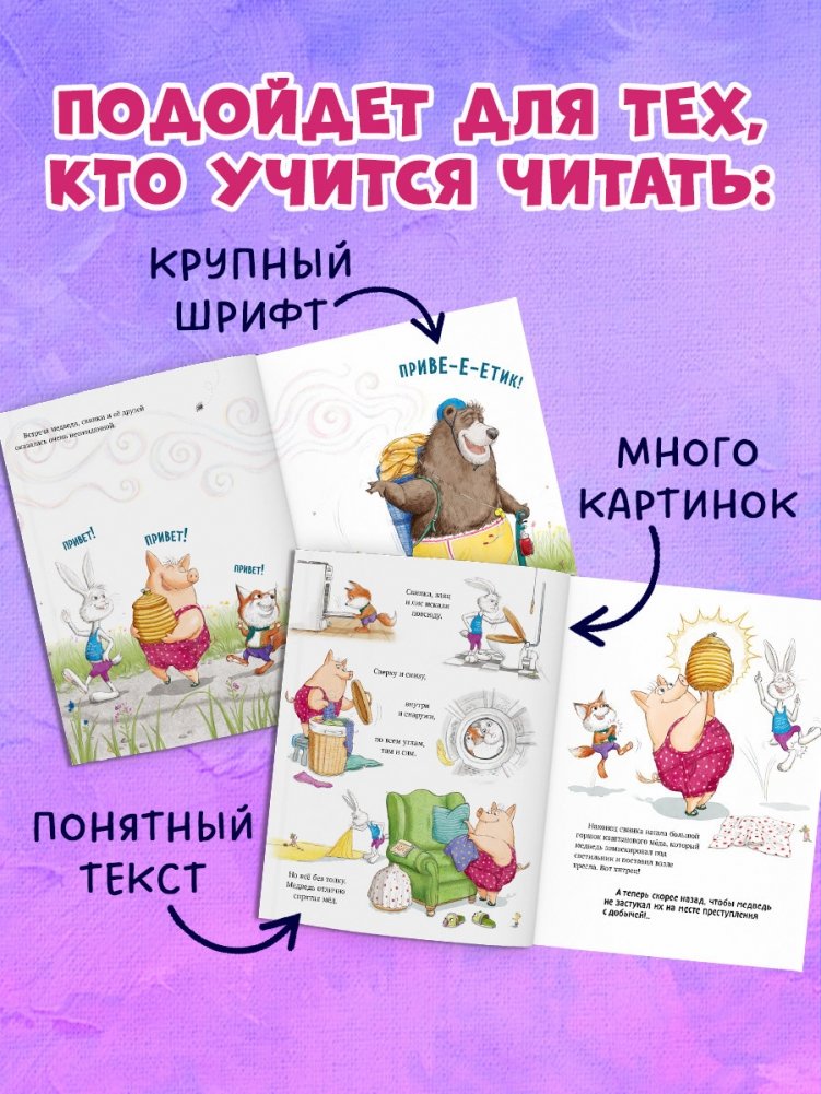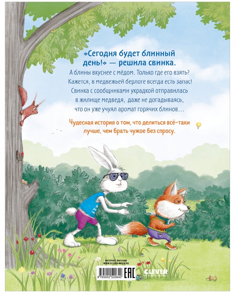 Свинка напекла блинов и решила взять немного меда у медведя… не спросив хозяина. А медведь решил стащить у свинки блины. По дороге друзья-воришки встретились! Что же произошло дальше? К счастью, все закончилось хорошо! Обязательно обсудите с детьми, как важно спрашивать разрешения, когда хочешь позаимствовать что-то у друзей.