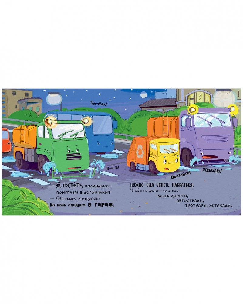 Как и всем детям, малышу мусоровозу очень не хочется ложиться спать. Он хочет продолжить веселье и отчаянно ищет, с кем бы ему покататься по ночным улицам. Но бетономешалка целый день трудилась на стройке, трамвай и электробус возили пассажиров, а самосвал доставлял груз, и все они очень устали и спешат на стоянку и в депо.