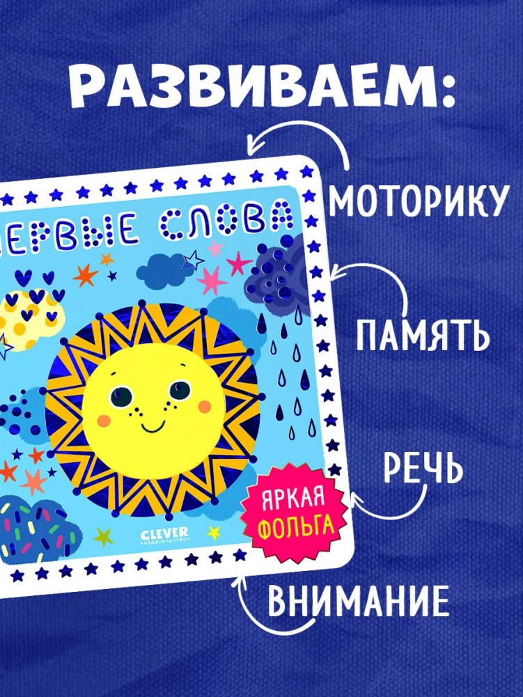 Книжка «Первые слова» со сверкающей фольгой, с картинками, которые подарят множество идей для игр, — идеальная книга для детей 1-3 лет для развития моторики, речи, внимания и памяти.