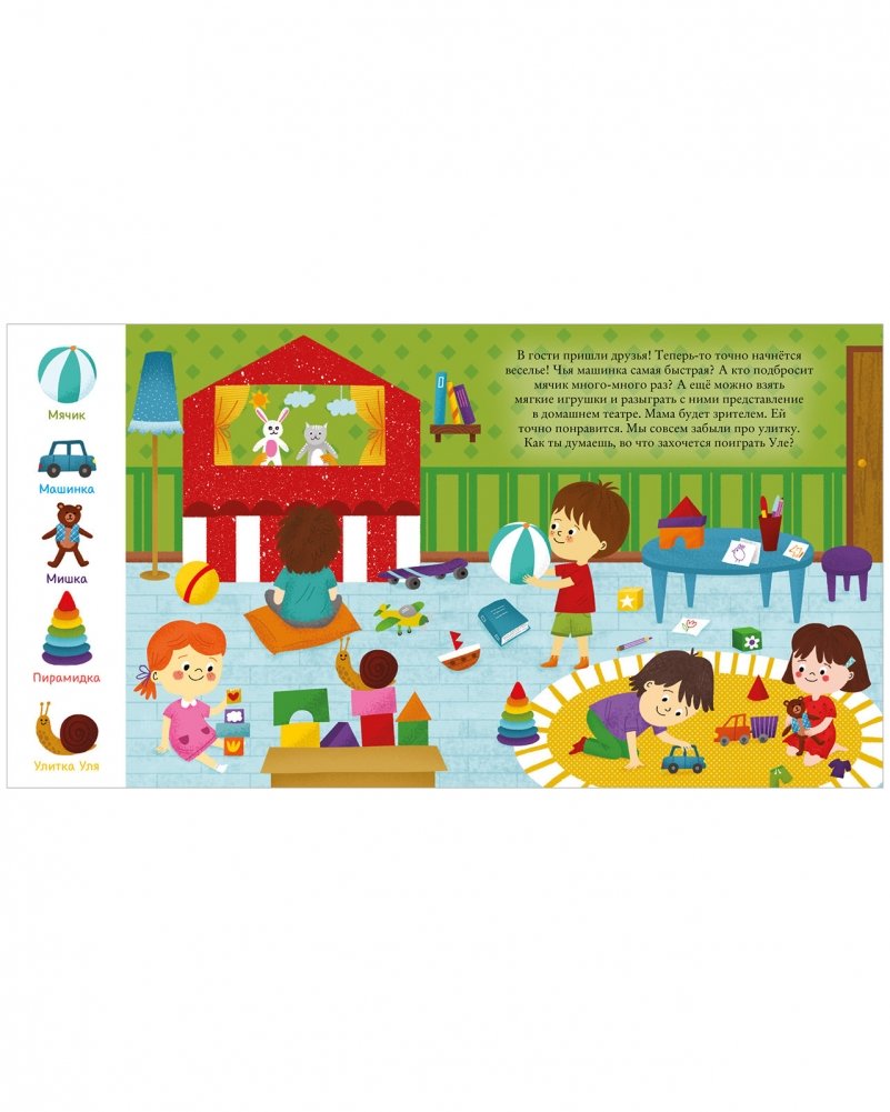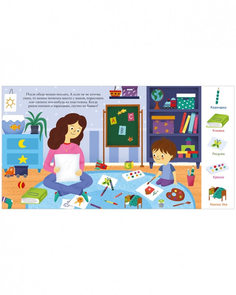На каждом развороте маленьких читателей ждет яркая панорамная картинка, предметы для поиска, новые слова, знакомство с важными правилами и режимом дня. Играя в популярную и любимую всеми малышами 2-4 лет игру «найди и покажи», ребенок узнает, как важно умываться и чистить зубы, завтракать, гулять, вовремя ложиться спать. Читая вместе с милыми героями — мальчиком и его питомцем, забавной улиткой Улей, — короткие простые тексты, малыш все будет делать весело и по правилам.