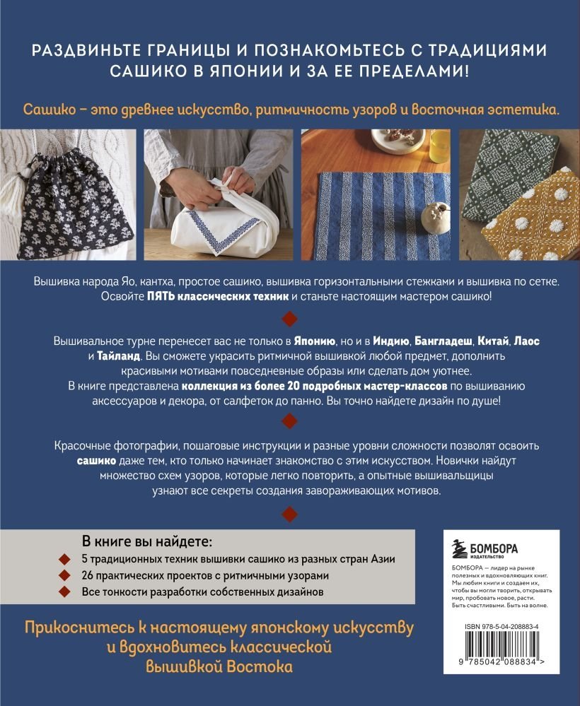 Раздвиньте границы и познакомьтесь с традициями сашико в Японии и за ее пределами! Вышивка народа Яо, кантха, простое сашико, вышивка горизонтальными стежками и вышивка по сетке. Станьте настоящим мастером сашико, освоив пять классических техник из Японии, Индии, Бангладеша, Китая, Лаоса и Тайланда. А отработать полученные знания помогут 26 подробных мастер-классов. Книга подойдет как новичкам, так и тем, кто уже знаком с сашико. Вдохновитесь вышивкой востока!