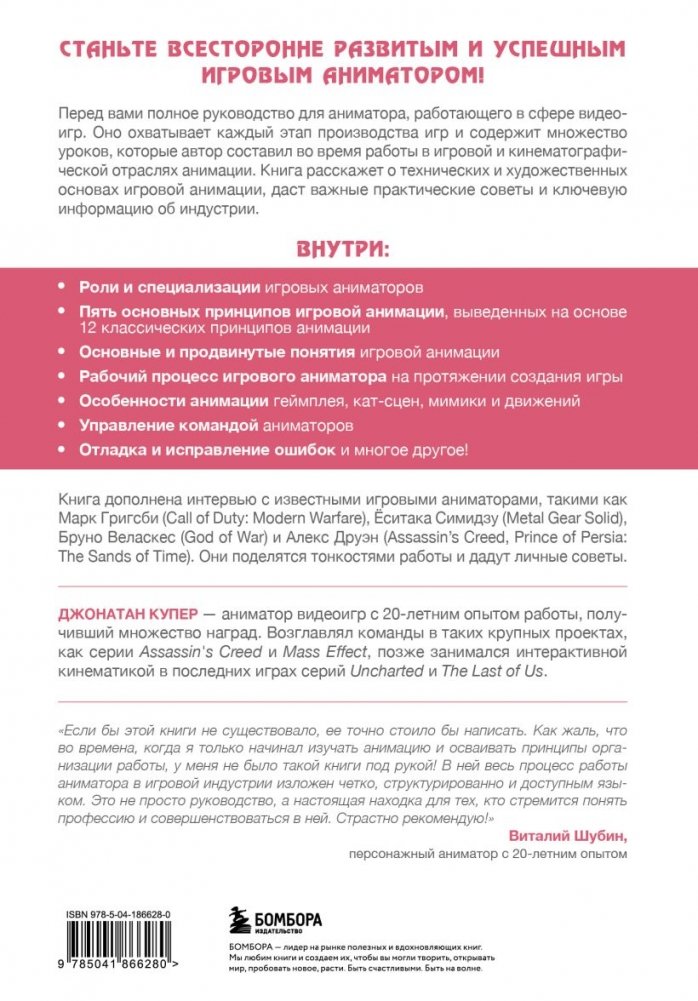 Станьте успешным игровым аниматором с помощью этого полного руководства, которое охватывает все этапы производства игр. Книга включает уроки, советы и ключевую информацию об индустрии, а также интервью с известными аниматорами всего мира. Узнайте о ролях, принципах и процессе работы аниматоров, а также об особенностях анимации геймплея, кат-сцен и многого другого. Это руководство подойдет как новичкам, так и опытным аниматорам, стремящимся развиваться в карьере.