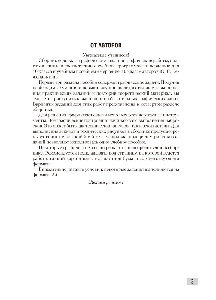 Сборник составлен в соответствии с программой и дополняет учебное пособие «Черчение» для 10 класса. Издание включает графические задачи и графические работы для изучения предмета. Использование сборника сокращает и облегчает труд учащегося и учителя при оформлении и проверке работ.