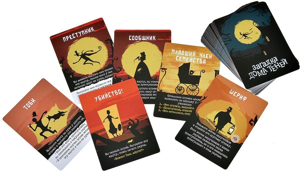 "Загадка тома Теней" – быстрая карточная игра со скрытыми ролями о противостоянии преступников и детективов. К счастью, общение, блеф и дедукция всегда помогут вам довести расследование до конца… или сорвать его и оставить всех с носом!