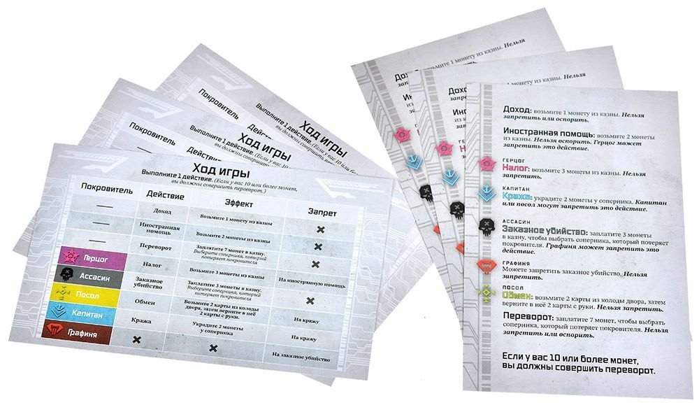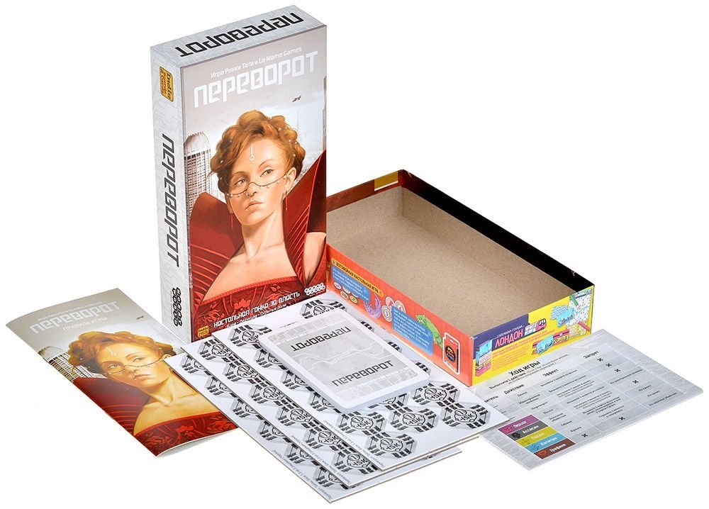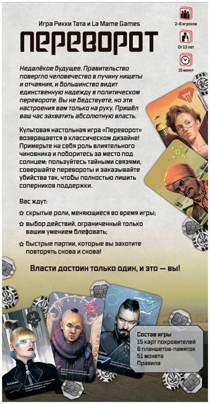 Культовая настольная игра "Переворот" возвращается в классическом дизайне! Примерьте на себя роль влиятельного чиновника и поборитесь за место под солнцем: пользуйтесь тайными связями, совершайте перевороты и заказывайте убийства так, чтобы полностью лишить соперников поддержки.