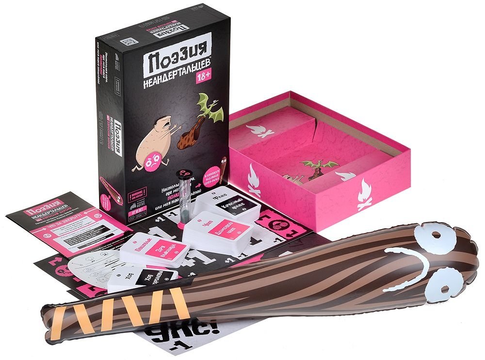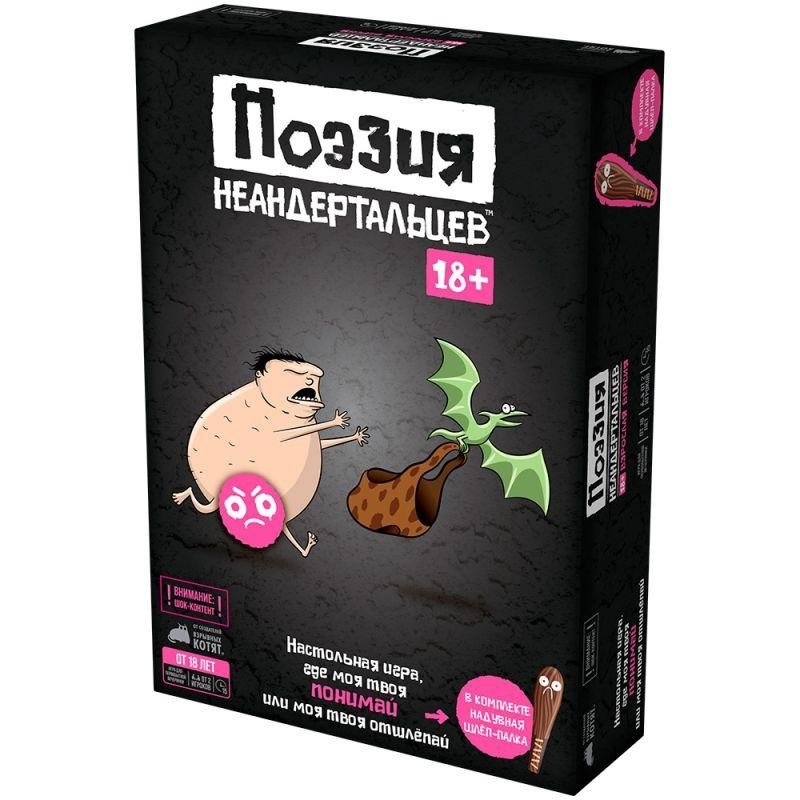 Пока детишки играют в базовую коробку, взрослые неандертальцы могут развлечься по-настоящему! Соберите два жарких племени, вручите главному доминанту шлёп-палку и объясняйте слова на картах так, чтобы вас поняли. А чтобы ваши булочки были защищены, придётся вовремя прерывать свой поэтический акт – а значит, говорить быстро и только односложными словами!