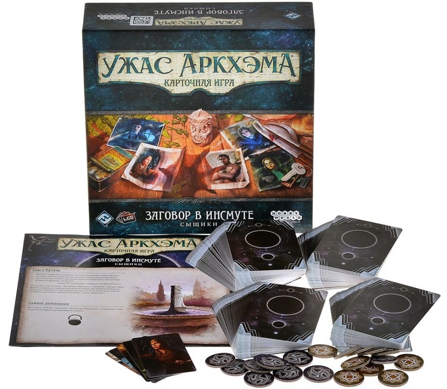 Дополнение "Заговор в Инсмуте. Сыщики" можно использовать для создания и улучшения колод в любой кампании или отдельном сценарии карточной игры "Ужас Аркхэма". Карточный "Ужас Аркхэма" – командная игра, участники которой в роли сыщиков срывают покровы с леденящих кровь тайн.