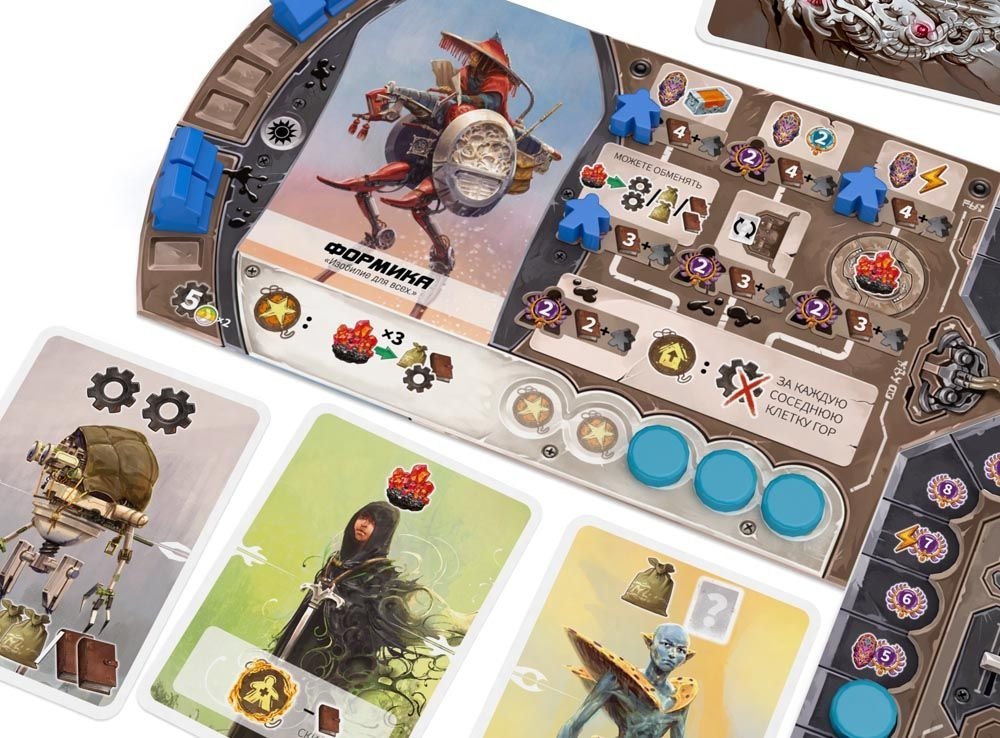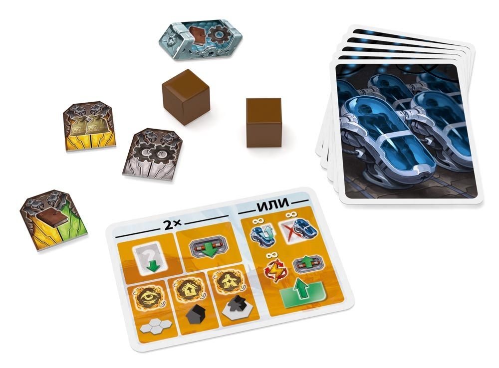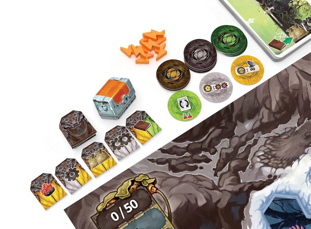 В состав настольной игры Проект «Возрождение» входит: игровое поле, 25 тайлов местности, 5 стартовых тайлов местности, 5 тайлов крупных локаций, 28 фишек энергии, 48 жетонов модулей, 30 жетонов механизмов, 28 жетонов контейнеров, 12 тайлов основных артефактов, 8 тайлов запасных артефактов.