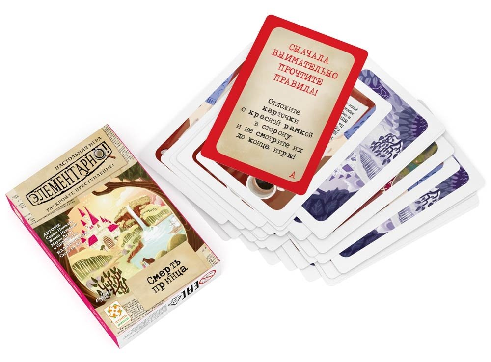 В состав настольной игры Элементарно: Смерть принца входят 37 карточек и правила игры.