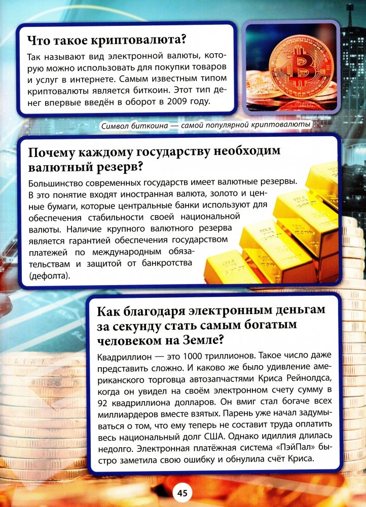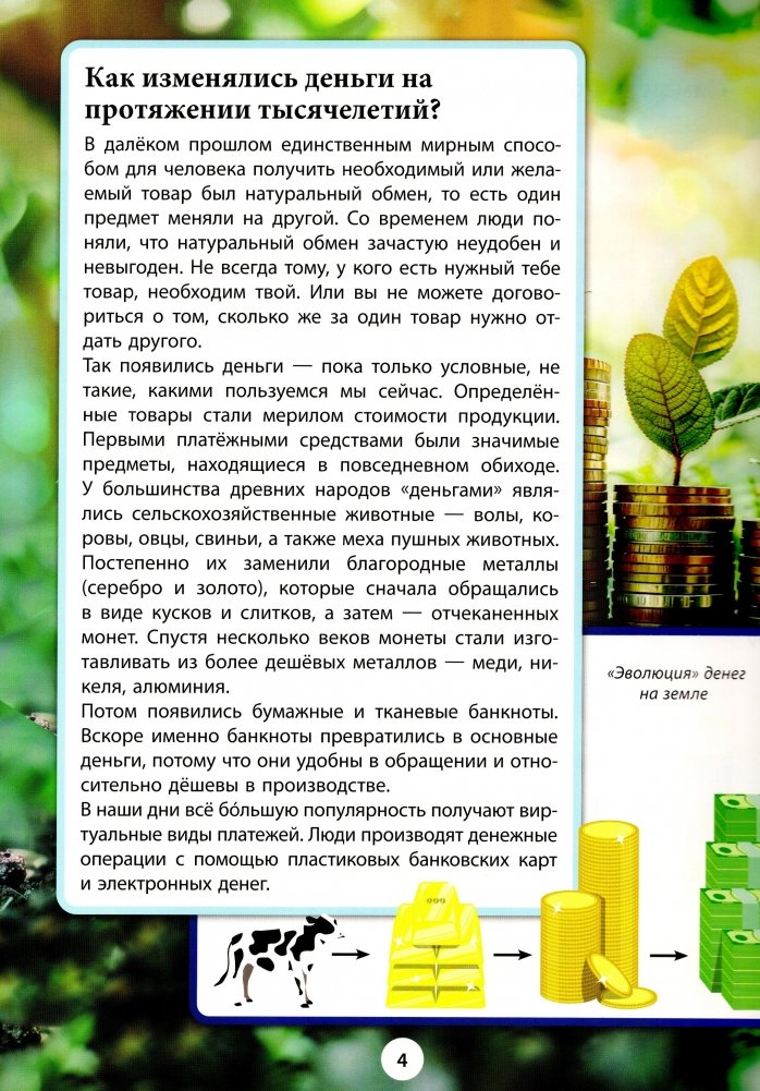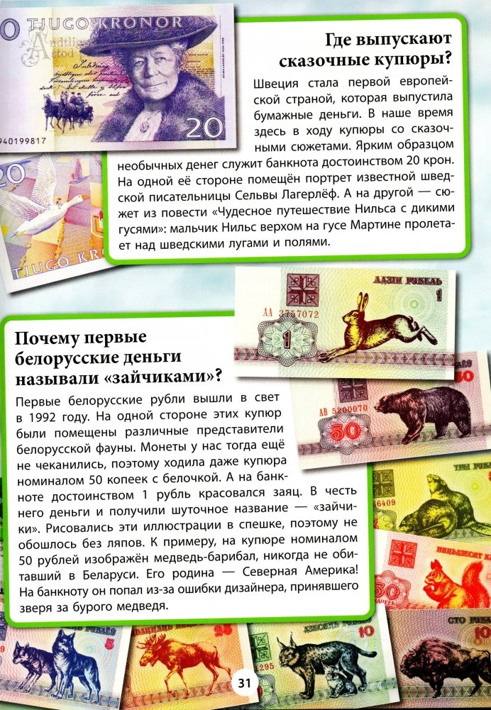 Красочно иллюстрированное издание знакомит читателей с историей и эволюцией денег. Кто из правителей первым стал чеканить свой портрет на монетах? Откуда пошло выражение «деньги не пахнут»? Что означает выражение «зарыть талант в землю»? Какие монеты первыми появились на территории Беларуси? Как наши предки гнались за длинным рублём? Сколько лет живут банкноты? Почему Беларусь называли страной миллионеров? Когда и где появились первые банки? Как происходит оплата по банковской карте? Как дети отыскали казну Полоцкого княжества? На эти и многие другие вопросы даёт ответ интерактивная книга «Деньги мира» с дополненной реальностью.