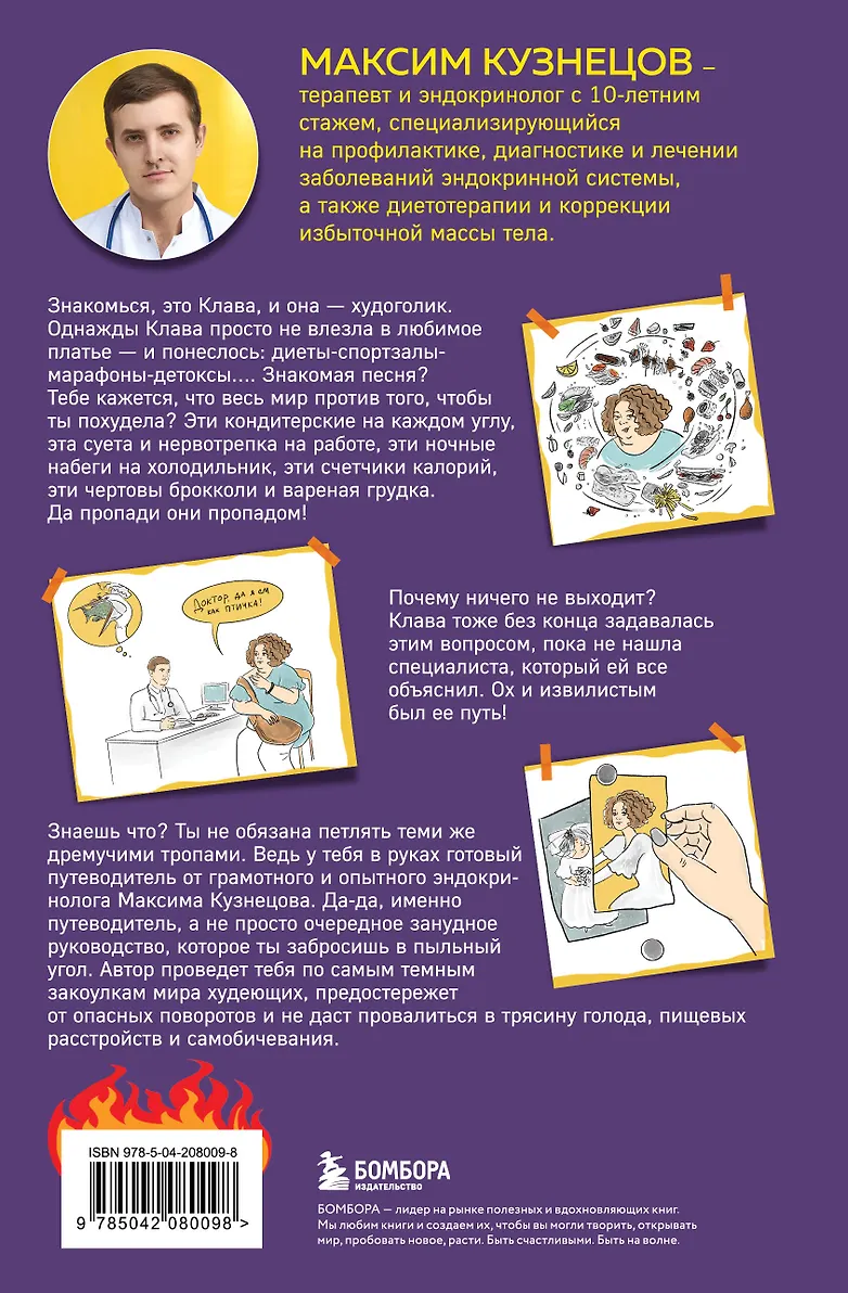 В этой книге Максим Кузнецов, врач-эндокринолог, специализирующийся на коррекции лишнего веса, поделится историей о Клаве — любящей матери и жене, решившей начать борьбу с незаметно для себя набранными килограммами. На примере Клавы он расскажет обо всех опасностях быстрой потери веса и объяснит, что главная сложность заключается не в том, чтобы наконец-то увидеть желанные цифры на весах, а в том, чтобы остаться с ними навсегда. Ты познакомишься с коллекцией наиболее распространенных ошибок любого новичка в похудении, предупредят об опасности "детоксов" и "волшебных" "жиросжигающих" добавок, проведут по галерее всеобщих заблуждений о питании и не забудут про самое главное — поддержку и понимание на протяжении всего этого нелегкого, но правильного пути.