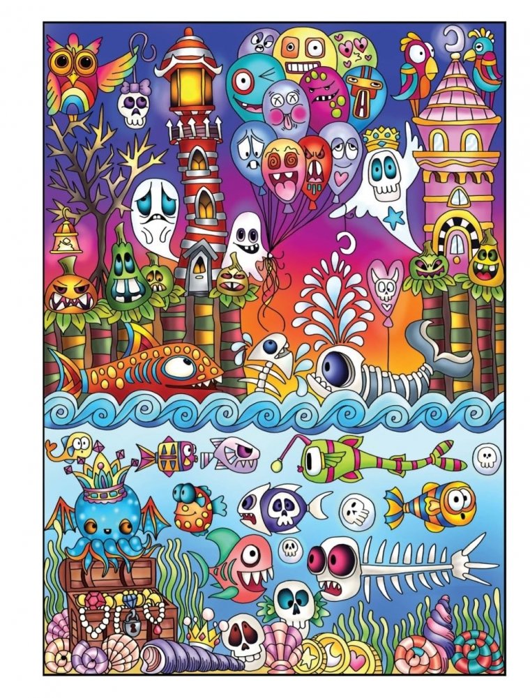 Explore wonderfully weird designs featuring all sorts of creepy, cute, and quirky creatures, from bats to cats, ghosts, skulls, spiders, and playful pumpkins, ensuring no shortage of kooky characters to color at any time of the year!