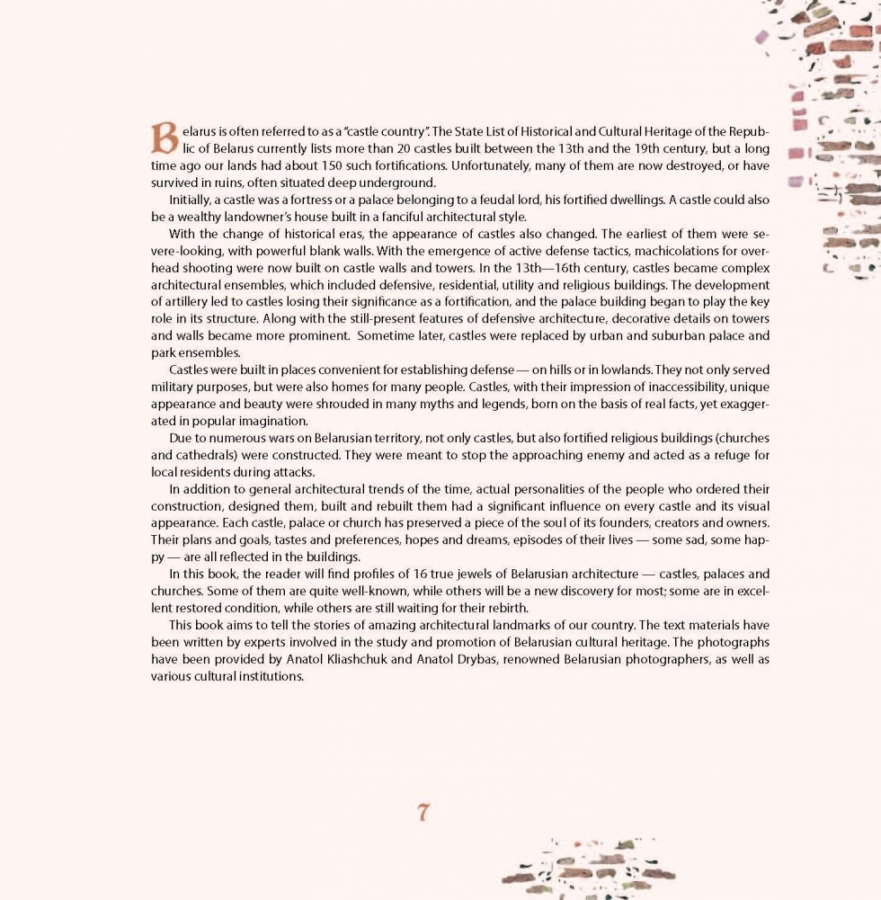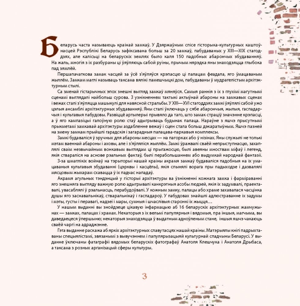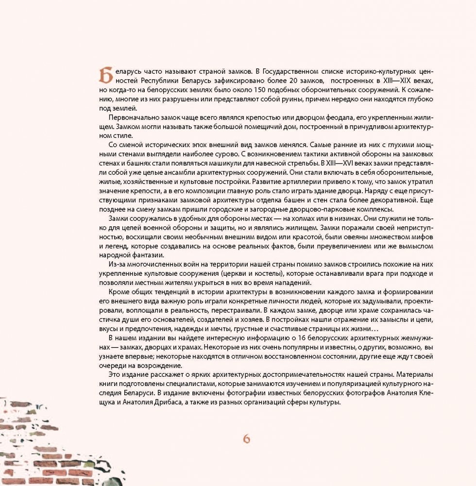 Кніга расказвае аб архітэктурных славутасцях Беларусі — замках ХІІІ—ХIХ стагоддзяў, аб гісторыі ўзнікнення гэтых пабудоў, а таксама аб іх уладальніках. Багата ілюстраванае выданне разлічана на шырокае кола чытачоў і запрашае ўсіх наведаць краіну замкаў — Беларусь.