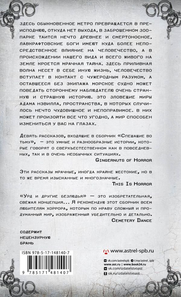 Здесь обыкновенное метро превращается в преисподнюю, откуда нет выхода, в заброшенном зоопарке таится нечто древнее и смертоносное, лавкрафтовские боги имеют куда более непосредственное влияние на человечество, а в происхождении нашего вида и всего живого на Земле кроется мрачная тайна. Здесь приливная волна несет в себе иную жизнь, человечество вступает в контакт с чужеродным разумом, а оставшееся без экипажа морское судно может поведать стороннему наблюдателю очень странную и страшную историю. Это зловещие миры Адама Нэвилла, пространства, в которых случилось нечто чудовищное и непоправимое. В них может произойти все что угодно, а мир способен измениться у вас на глазах.