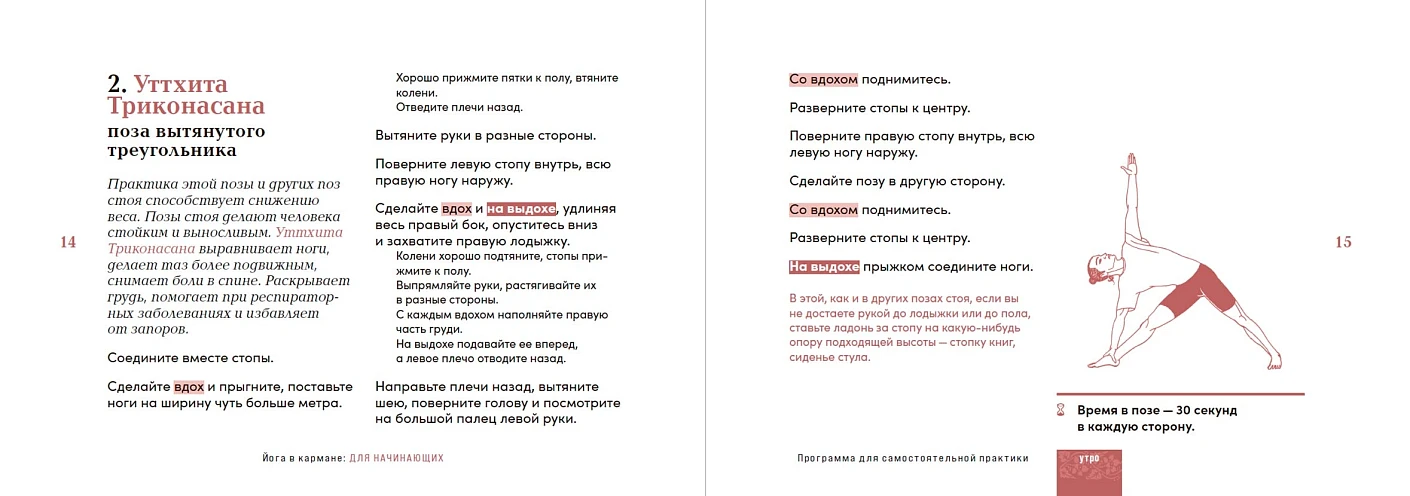 - Для удобства восприятия в описании позы выделены вдохи и выдохи, время пребывания в позе, различные расстояния (между руками, ногами). Текст позы поделен на активные действия («Встаньте в центр коврика») и «внутренние действия» («Расслабьте живот»), которые набраны мелким шрифтом.