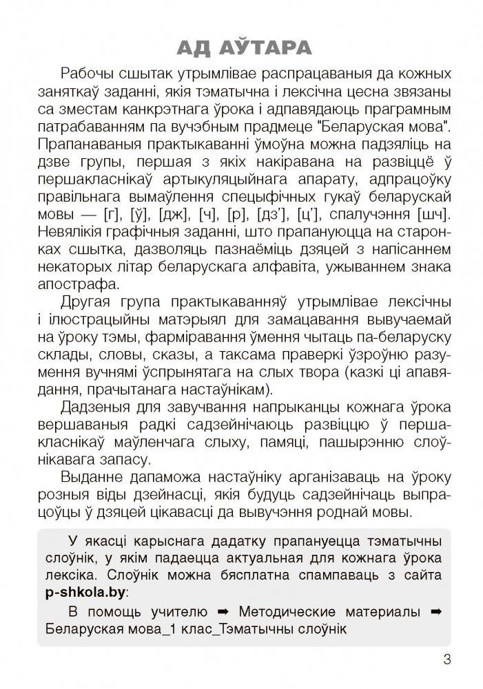 Выданне змяшчае дадатковыя паўрочныя заданні да ўрокаў беларускай мовы ў 1-м класе, якія адпавядаюць вучэбнай праграме і прыкладнаму каляндарна-тэматычнаму планаванню. Прадстаўленыя практыкаванні могуць быць выкарастаны як пры азнаямленні з новай тэмай, так і пры замацаванні вывучанага раней матэрыялу.