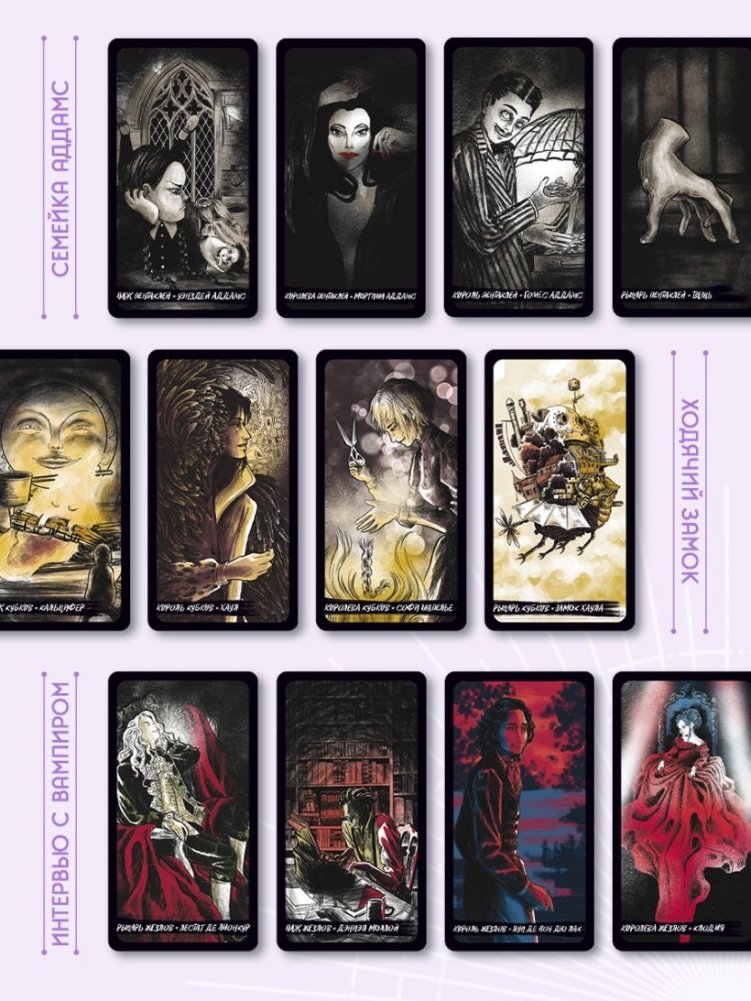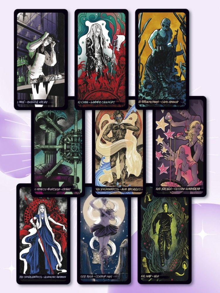 На Старших арканах Таро и придворных картах изображены персонажи культовых саг, в числе которых Арагорн, Эрик Дрэйвен, члены семейки Аддамс, Баффи Саммерс и многие другие.