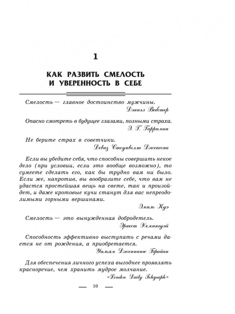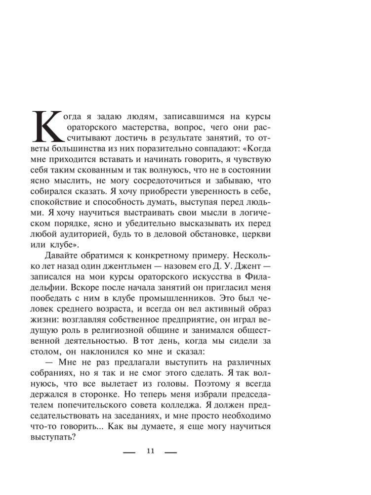 Вы не задумывались, почему многие умные и интеллигентные люди, которые не испытывают трудностей в разговорах с глазу на глаз, вдруг словно проглатывают язык и дрожат от страха, оказавшись даже перед самой немногочисленной аудиторией? На самом деле этот страх довольно легко преодолеть. Это книга для всех, кто стремится быть впереди. На каждой странице великий Дейл Карнеги показывает, как его оригинальная методика, позволяющая привлекать и удерживать внимание слушателей, будет помогать вам во всех областях жизни. Прочитав руководство, вы научитесь: