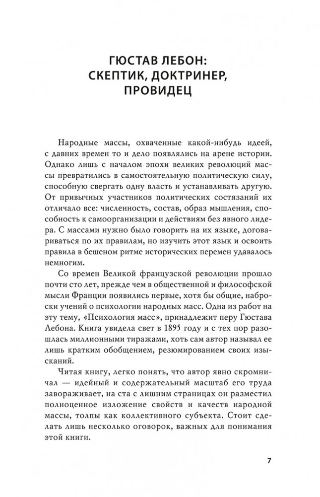 Лебон создал свой труд на злобу дня, в ответ на исторические вызовы, с которыми столкнулось европейское общество второй половины XIX века. Но эта книга стала настоящим проводником в пространство публичной жизни и в мир идей того времени — в ней описано начало общественных потрясений, на наших глазах разворачивается их завершение. А может быть, и продолжение...