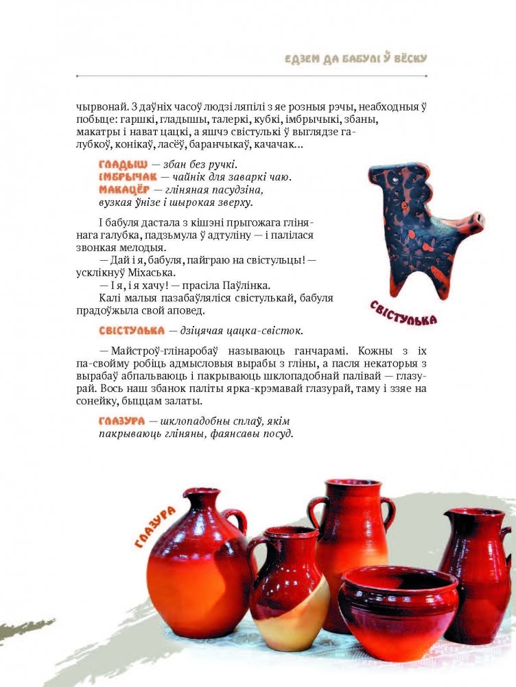 У кнізе «Едзем да бабулі ў вёску» ў апавядальнай форме падаецца інфармацыя аб асаблівасцях жыцця беларусаў у вёсцы ў мінулым. Разам з героямі кнігі дзяўчынкай Паўлінкай і хлопчыкам Міхаськам чытач даведаецца аб традыцыйных занятках сялян, іх абрадах, прыладах працы, побыце, прадметах дэкаратыўна-прыкладнога мастацтва, раслінах і жывёлах, нацыянальных стравах, святах. Выданне дапоўнена цікавымі пытаннямі і заданнямі, творамі мастацкай літаратуры, каляровымі ілюстрацыямі, значэнне незнаёмых слоў больш падрабязна раскрыта ў тлумачальным слоўніку.