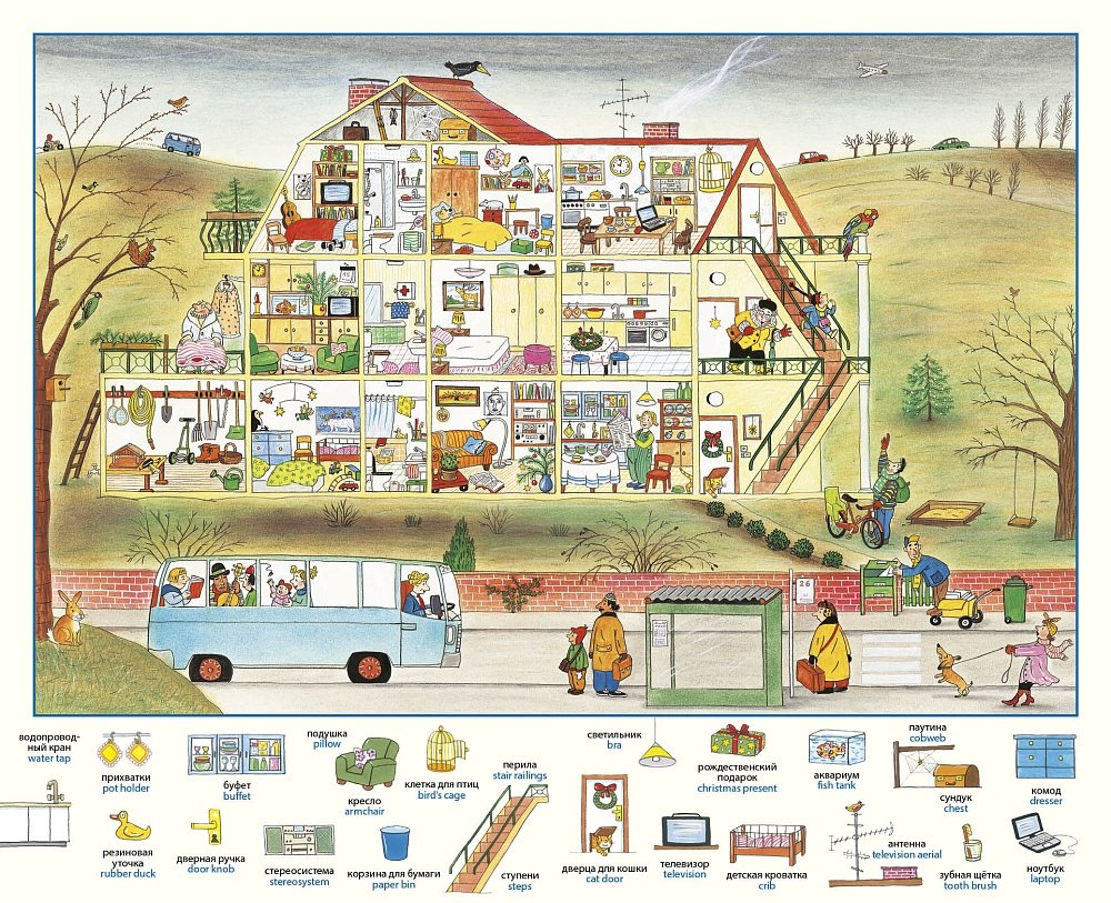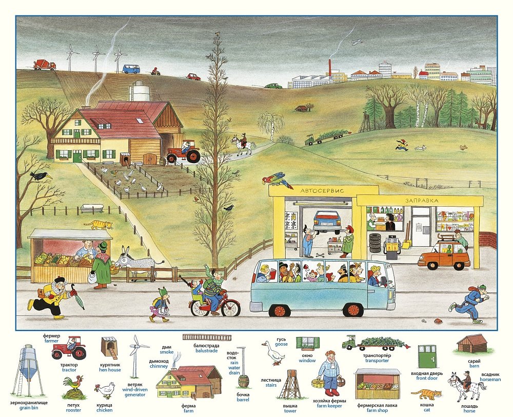 Зимой, весной, летом и осенью — можно круглый год гулять по полюбившемуся городку. И даже обнаружить, что тёплой летней ночью кое-кто не спит. На каждом развороте вас ждут рисунки с подписями — отличный инструмент для изучения языка в игровой форме!