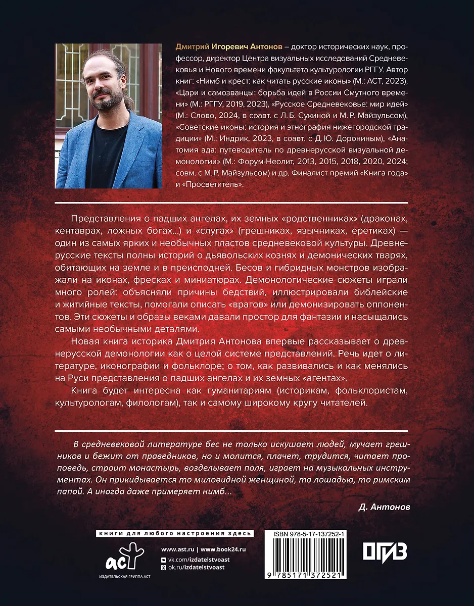 Дмитрий Игоревич Антонов — доктор исторических наук, профессор, директор Центра визуальных исследований Средневековья и Нового времени факультета культурологии РГГУ. Автор книг: "Нимб и крест: как читать русские иконы" (М.: АСТ, 2023), "Цари и самозванцы: борьба идей в России Смутного времени" (М.: РГГУ, 2019, 2023), "Русское Средневековье: мир идей" (М.: Слово, 2024, в соавт. с Л. Б. Сукиной и М. Р. Майзульсом), "Советские иконы: история и этнография нижегородской традиции" (М.: Индрик, 2023, в соавт. с Д. Ю. Дорониным), "Анатомия ада: путеводитель по древнерусской визуальной демонологии" (М.: Форум-Неолит, 2013, 2015, 2018, 2020, 2024; в соавт. с М. Р. Майзульсом) и др. Финалист премий "Книга года" и "Просветитель".
