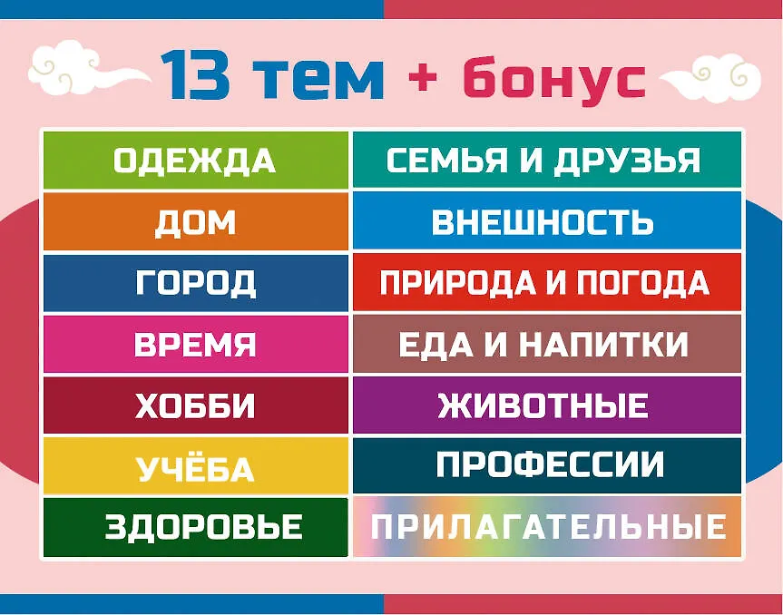 Хотите учить корейский весело и эффективно? Тогда без флеш-карточек вам не обойтись! На лицевой стороне вы найдете корейское слово, его перевод, транскрипцию и яркую картинку для упрощения запоминания. На обратной стороне — примеры употребления. Таким образом вы не просто заучите слово, но и сможете использовать его в речи. Слова разделены на 13 категорий, каждая из которых выделена своим цветом.