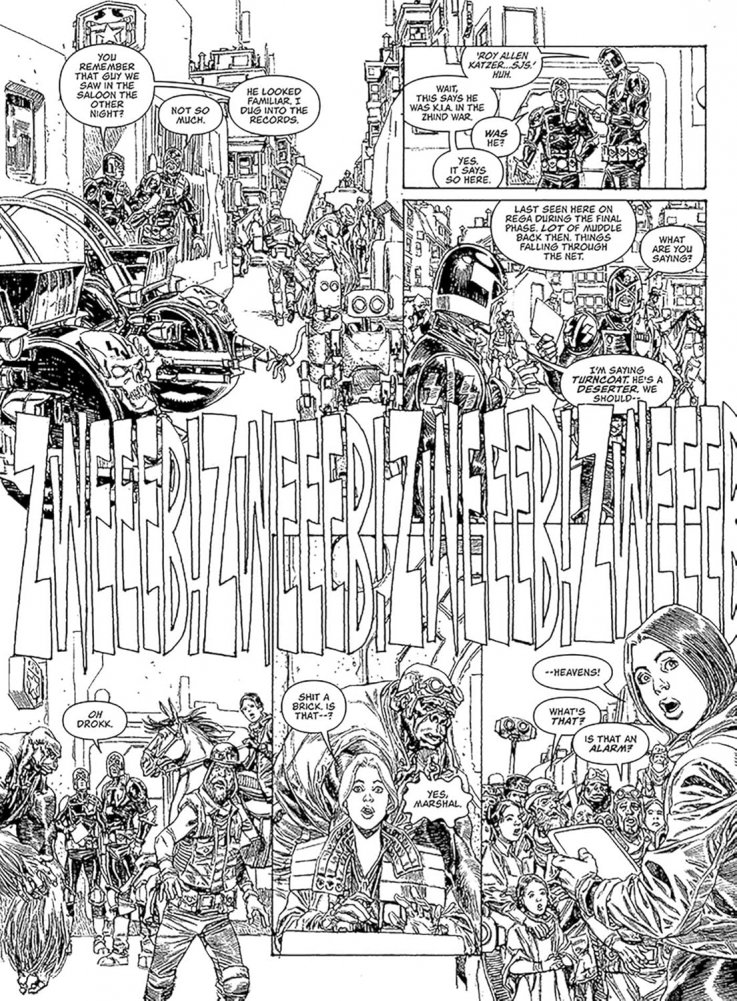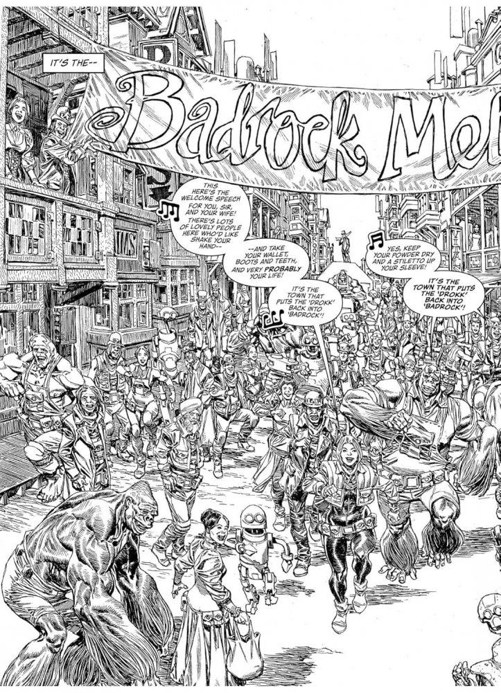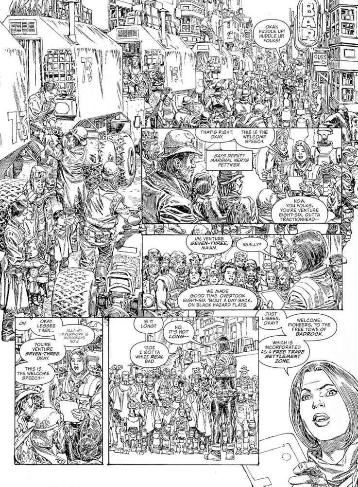 Having narrowly avoided being wiped from the face of the planet by Munce, Inc., Badrock is now a thriving boom town, predicated on an uneasy peace between the Zhind, the settlers and the Mega-City One Justice Department. Designated a Free Town, the future’s there for taking, and folks from all over the planet 43 Rega are flocking to Badrock to begin anew, all under the watchful, disapproving eye of the SJS. Many are hardworking, honest folk – but some are parasites, drawn to Badrock to find new ways of making a killing. And when a caravan of settlers is brutally slaughtered, it’ll take all that Colonial Marshal Metta Lawson has to stop an outright war.