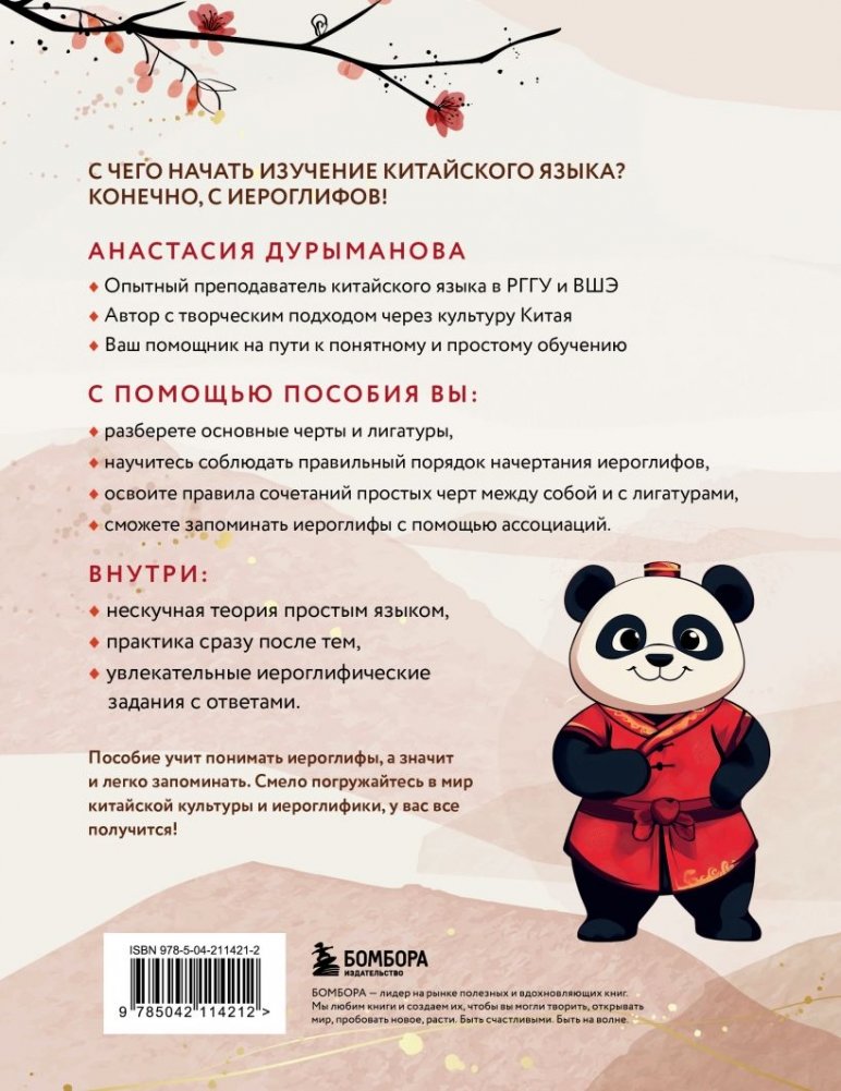 Анастасия Дурыманова, опытный преподаватель в РГГУ и ВШЭ, готова доказать, что китайский язык вовсе не сложный, а разобраться в письменности сможет даже ребенок. Пособие в ваших руках – путеводитель в увлекательный мир китайской иероглифики для начинающих. С помощью книги вы освоите правильный порядок написания черт, выучите множество иероглифов по их происхождению и начертанию, погрузитесь в тонкости культуры языка и страны. Пособие разбирает такие темы, как: основные черты и лигатуры, правила сочетаний простых черт между собой и с лигатурами, группы иероглифов с общими ключами, а также содержит увлекательные иероглифические задания с ответами и множество письменной практики. Делайте смелый первый шаг в изучении китайского языка с нашей книгой!