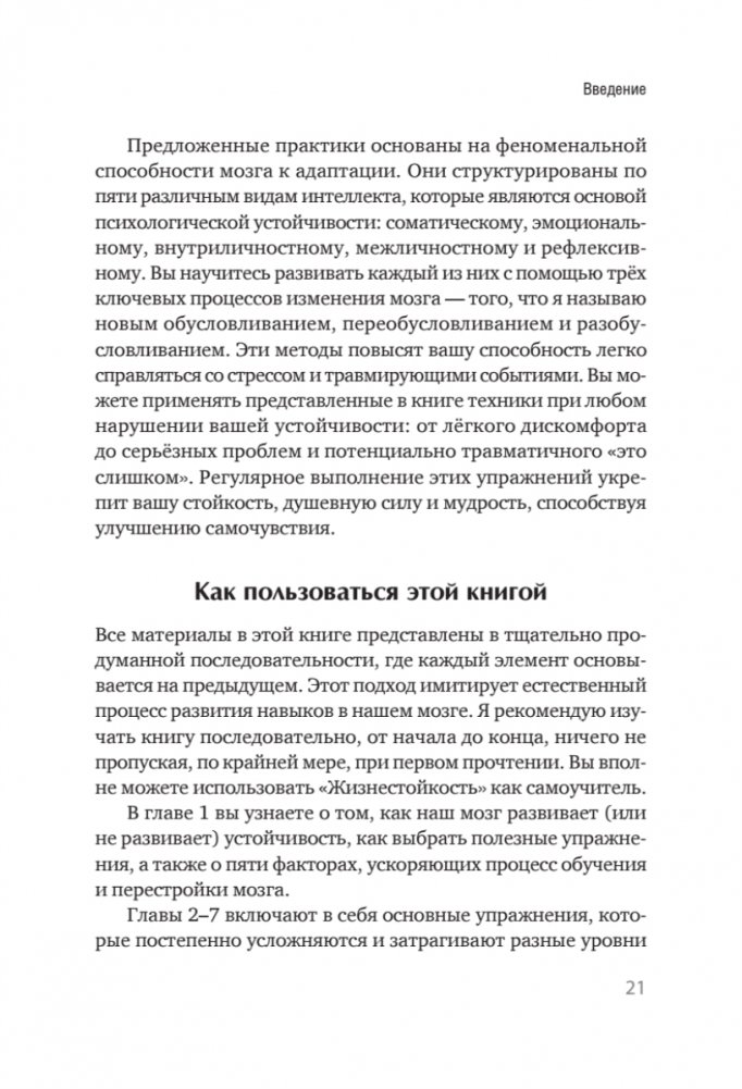 Как помочь человеку вернуться к нормальной жизни после разного рода травм и даже таких событий, которые кажутся непреодолимыми? Только путём укрепления психологической устойчивости и жизнестойкости. Жизнестойкость — это умение адаптироваться к переменам, справляться с трудностями и восстанавливаться после невзгод. Способность противостоять трудностям — естественное свойство человеческого мозга, данное нам от природы. Каждый может развить в себе жизнестойкость — научиться легче воспринимать новое, развиваться и меняться. Эта книга посвящена практике — ведь именно регулярная практика восстанавливает и укрепляет жизнестойкость.