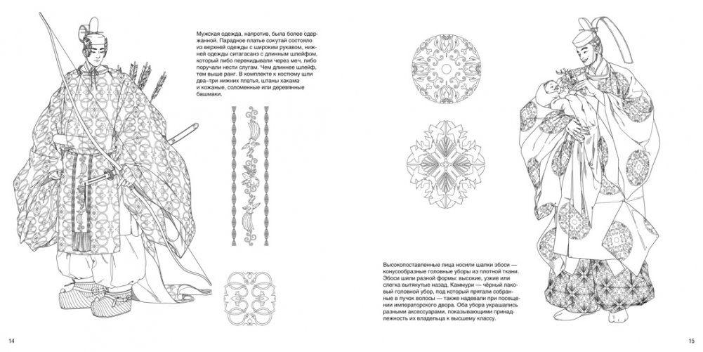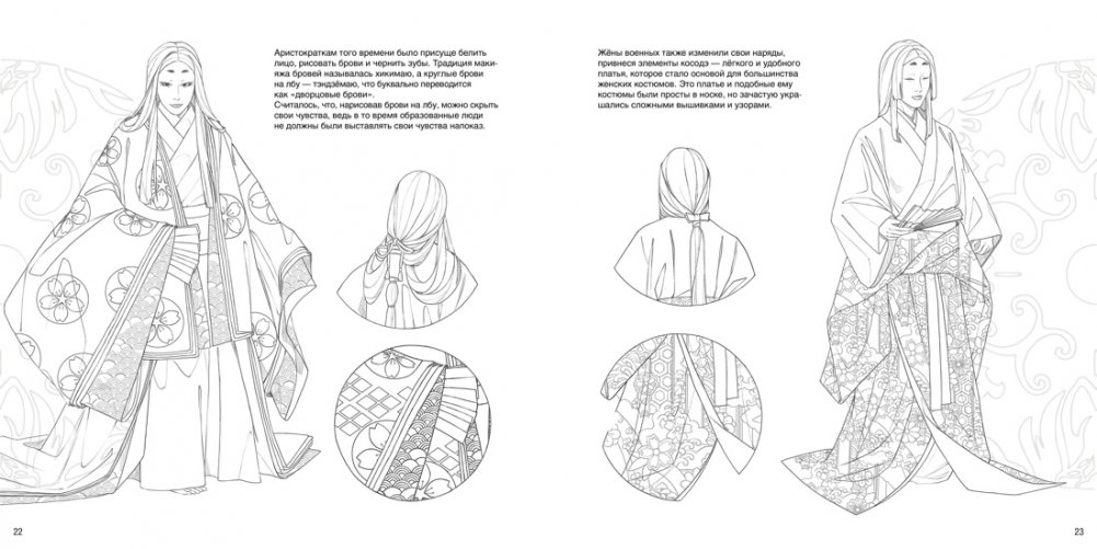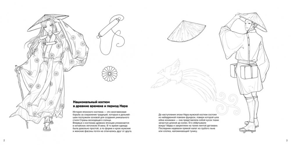 Книга для раскрашивания «Японский национальный костюм» — это коллекция из 54 иллюстраций от трёх современных художниц: Plus+, BRIT/0.5, shuihaixiao. Каждая из них обладает уникальной графической манерой. Иллюстрации сопровождаются краткой исторической справкой о том, как на протяжении эпох менялась одежда жителей Страны восходящего солнца.