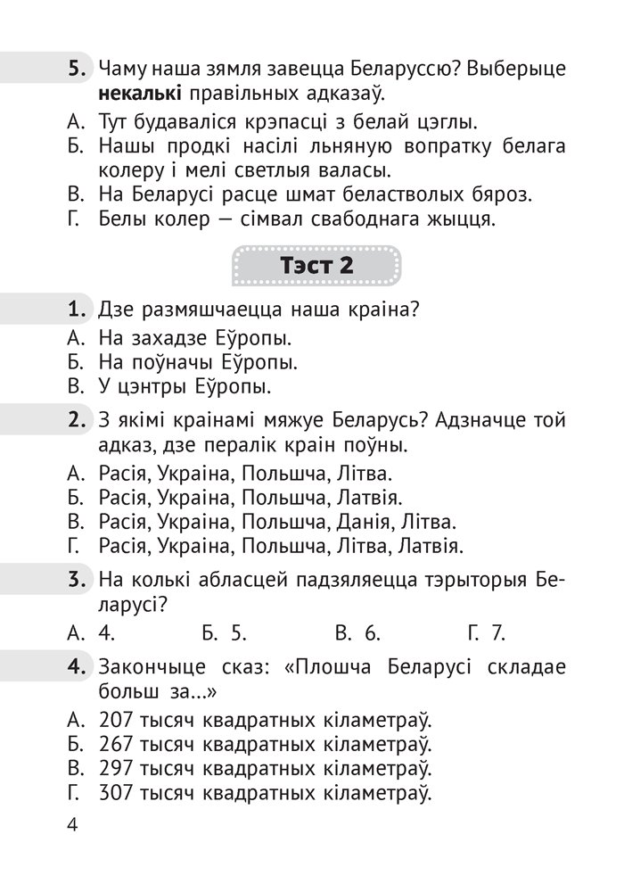 Чалавек і свет. Мая Радзіма — Беларусь. 4 клас. Тэсты
