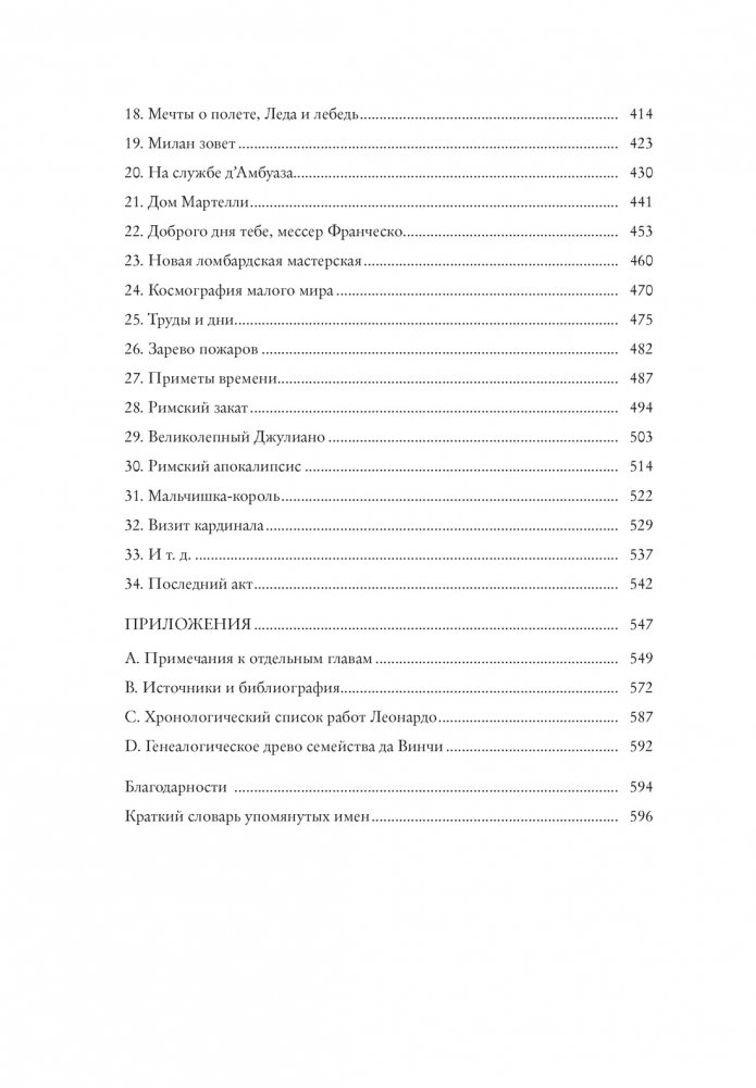 Как смог я рассказать эту историю? Прежде всего – прислушавшись к голосам современников самого Леонардо, свидетельствам неполным, зато полученным из первых уст,.. воспоминаниям тех, кто знал его лично, к документам и бумагам родных, контрактам, письмам, хроникам, налоговым декларациям, доносам и материалам судебных процессов, отчетам послов, записным книжкам художников и инженеров, славословиям придворных поэтов, путевому дневнику кардинальского секретаря.